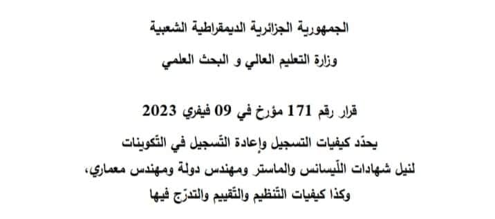 تبعا للقرار الوزاري رقم 171 مؤرخ في 9 فيفري 2023 الذي يحدد كيفيات التسجيل وإعادة التسجيل في التكوينات لنيل شهادة الليسانس و الماستر ومهندس دولة و مهندس معماري وكذا كيفية التنظيم والتقييم والتدرج فيها
