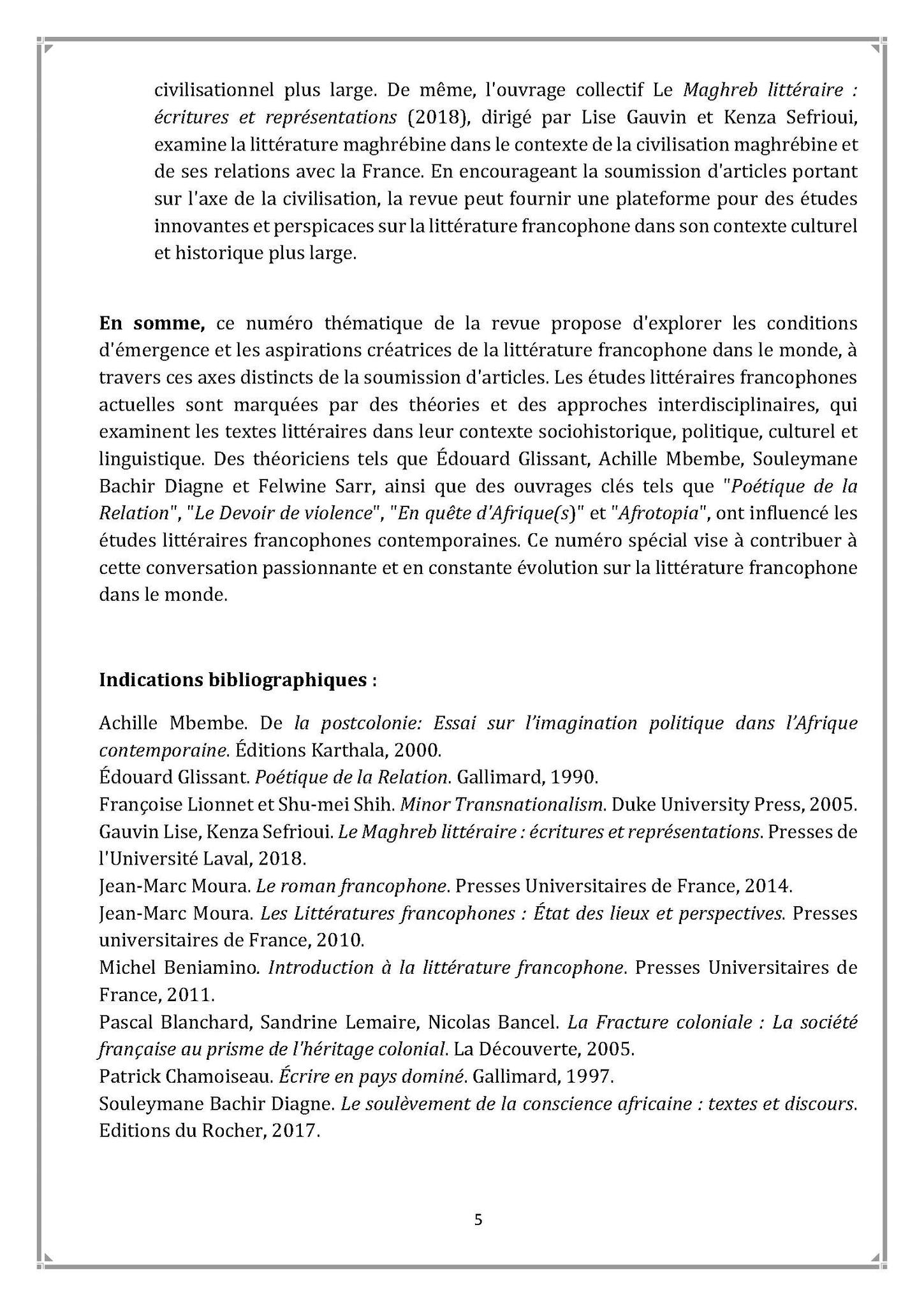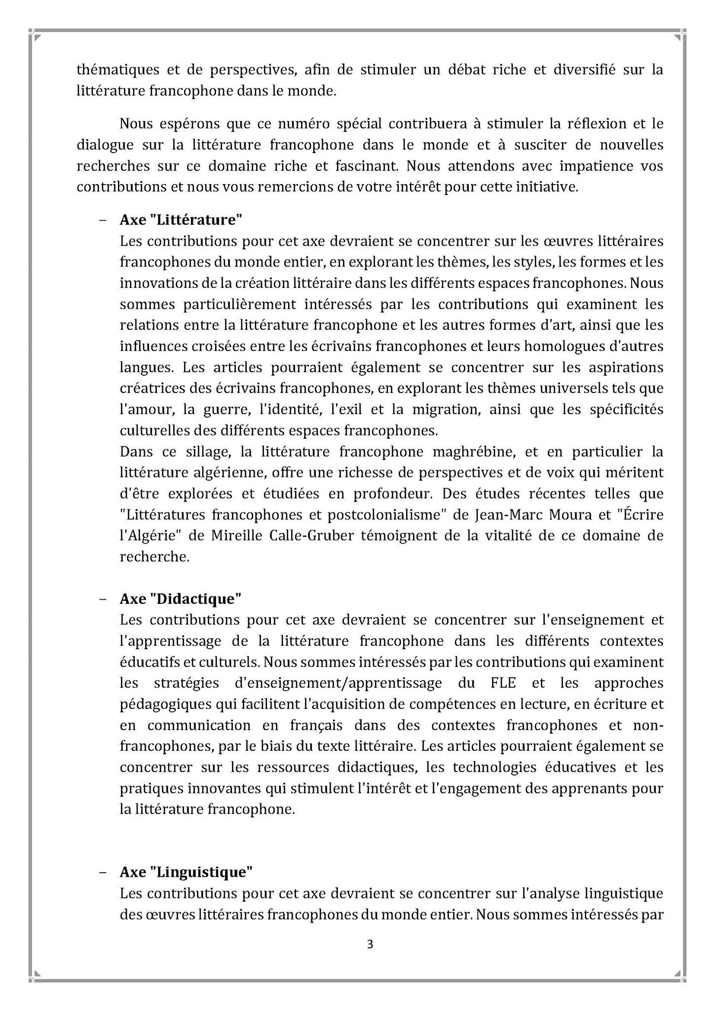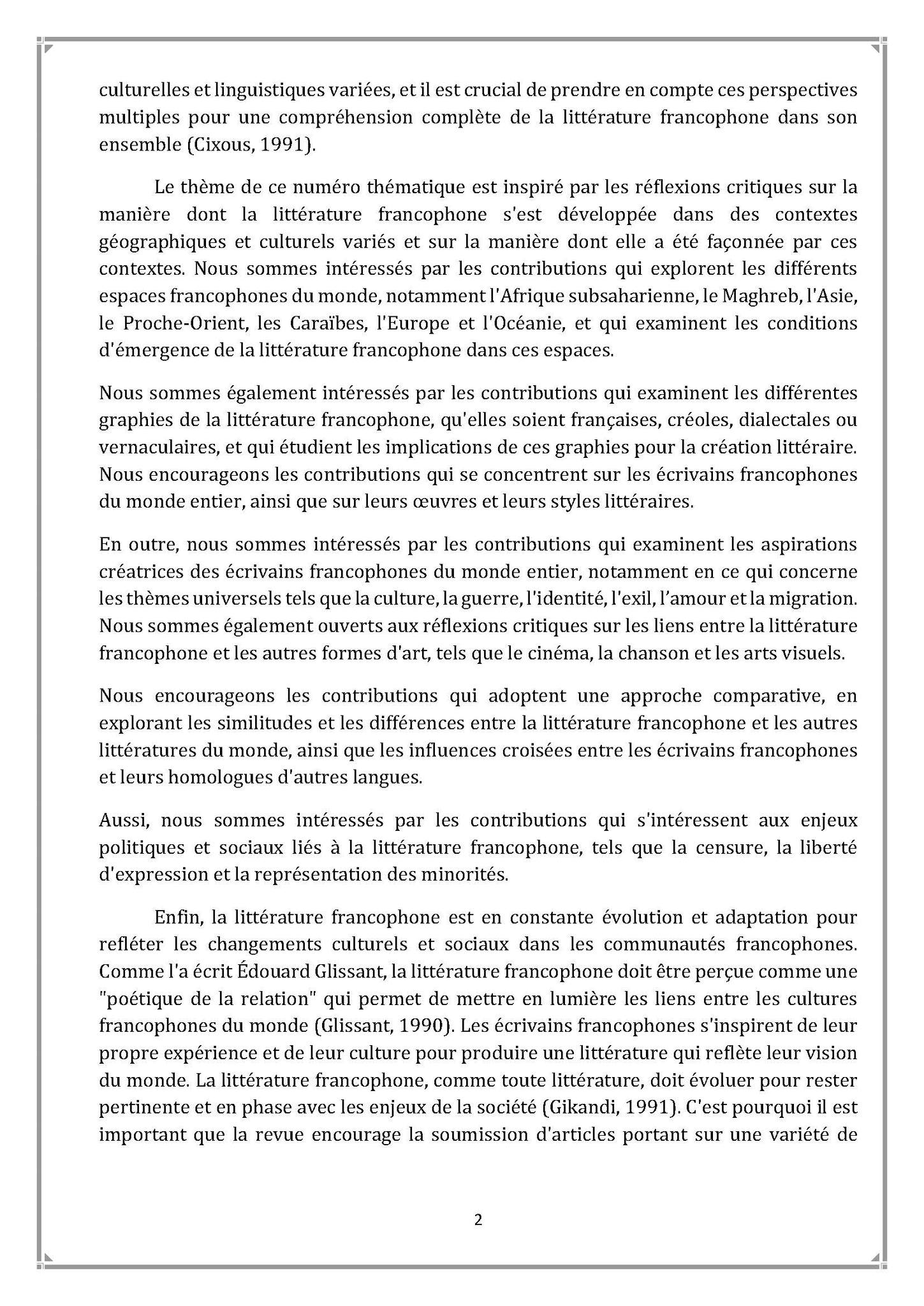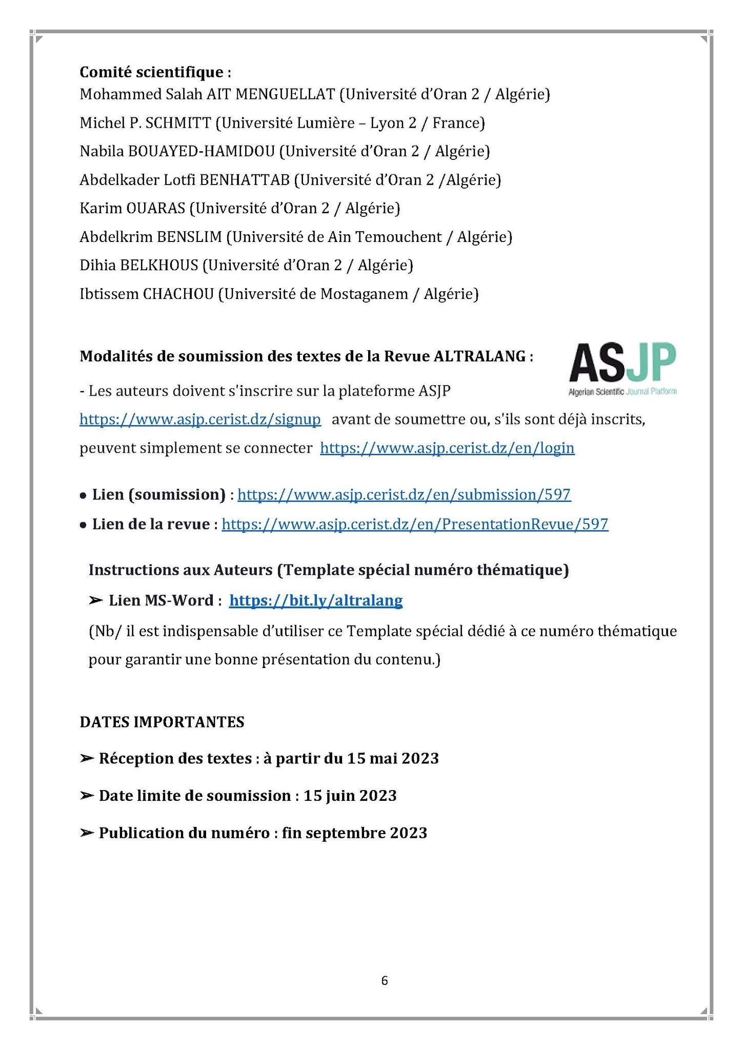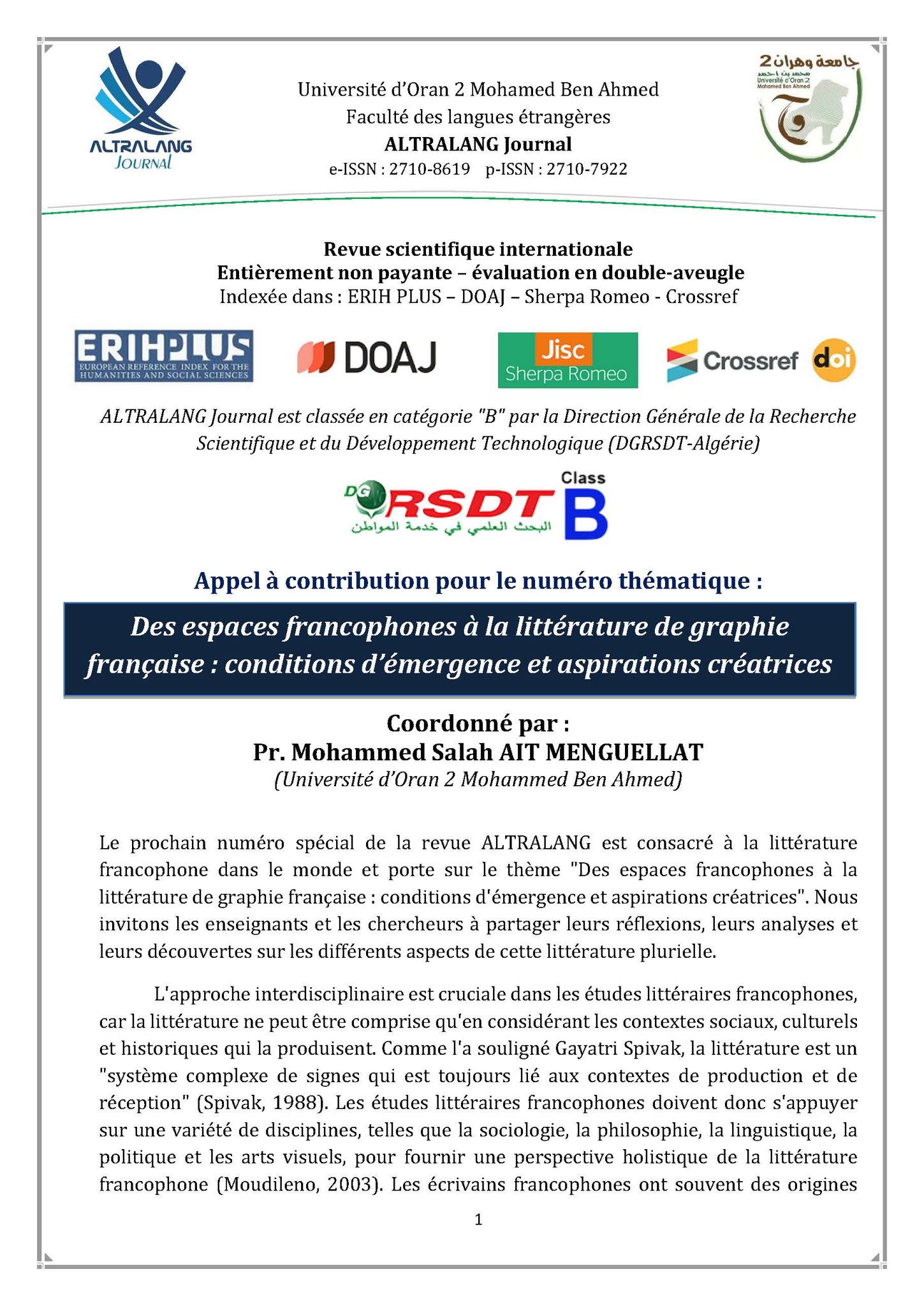 Appel à contribution pour un numéro thématique de la revue « ALTRALANG Journal » ( Catégorie B ) sur le thème : « Des espaces francophones à la littérature de graphie française : conditions d’émergence et aspirations créatrices », coordonné par : Pr. Mohammed Salah AIT MENGUELLAT (Univ. Oran 2)