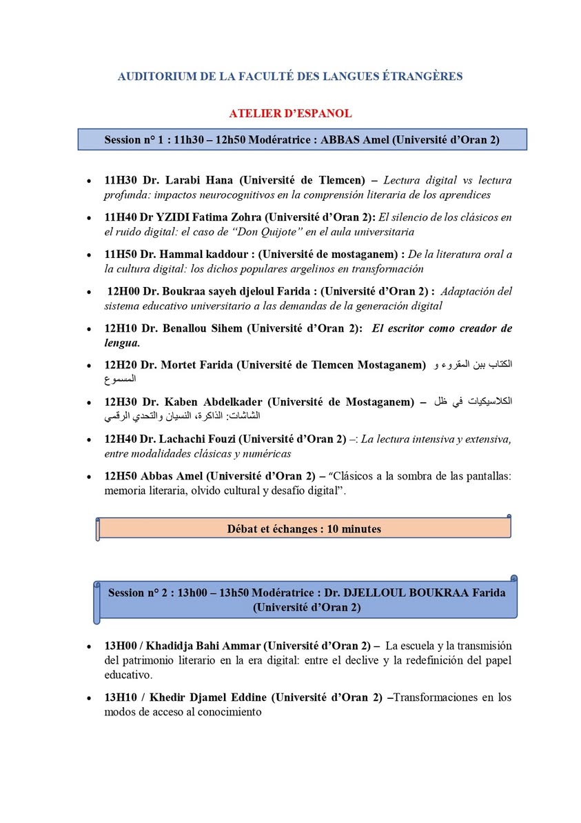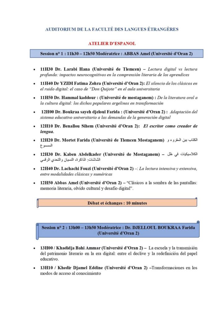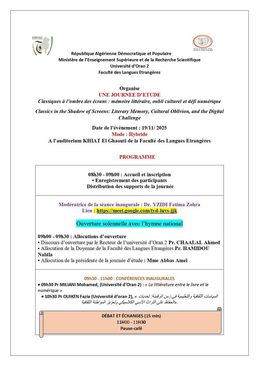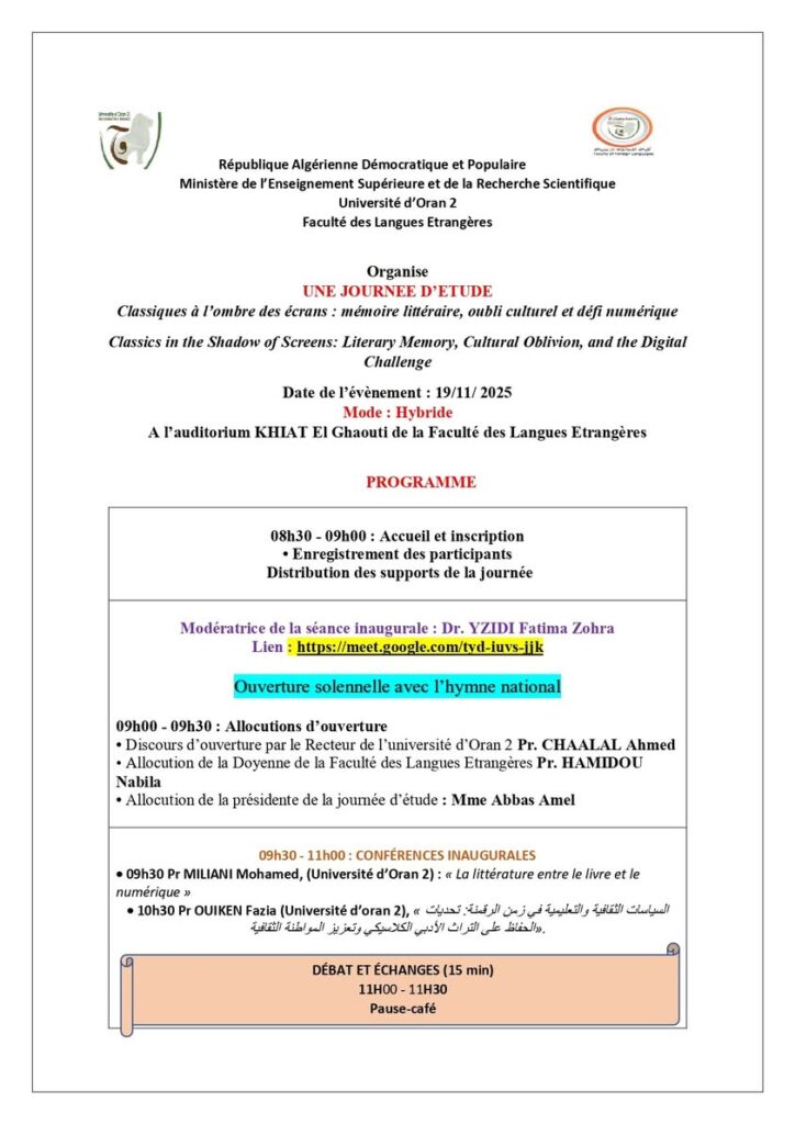 Journée d’étude « Classiques à l’ombre des écrans : mémoire littéraire, oubli culturel et défi numérique », organisée par la Faculté des Langues Étrangères – Université d’Oran 2. qui se tiendra le mercredi 19 novembre 2025