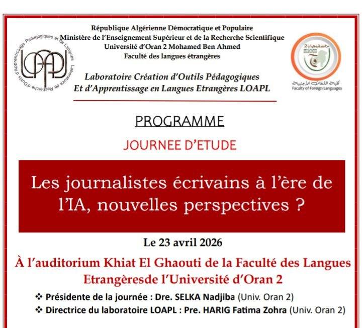 Le Laboratoire de Création d’Outils Pédagogiques et d’Apprentissage en Langues Étrangères (LOAPL), en collaboration avec la Faculté des Langues Étrangères de l’Université d’Oran 2 Mohamed Ben Ahmed, organise :