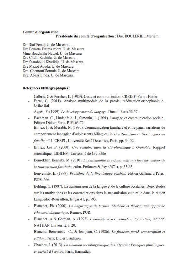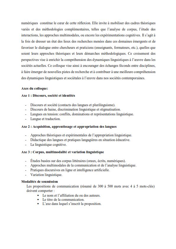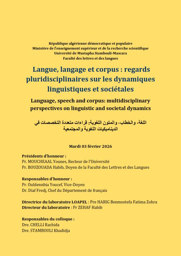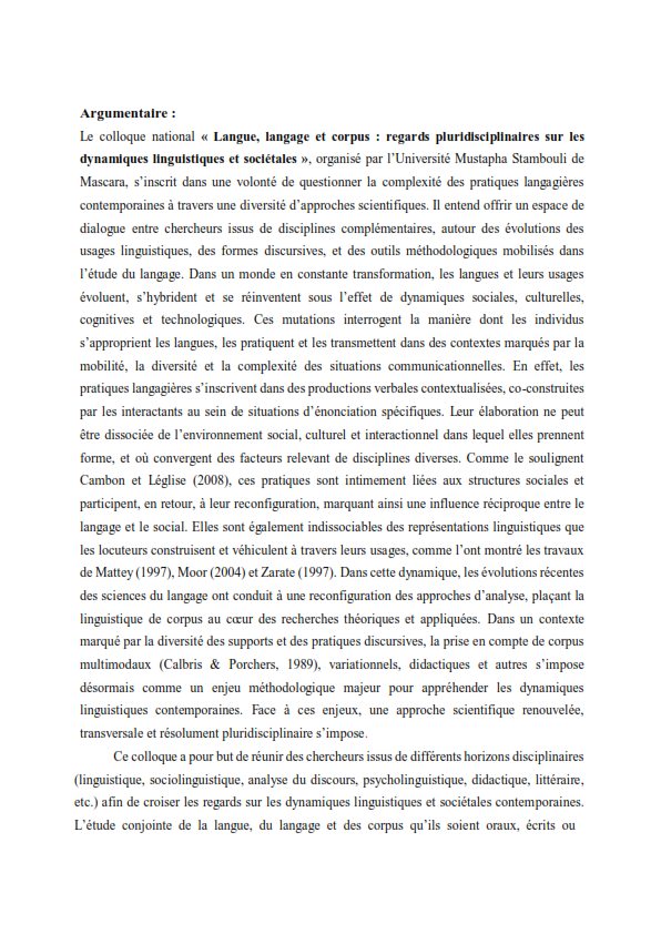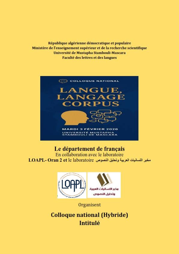 Appel à Communications : Colloque National (Hybride) Langue, langage et corpus : regards pluridisciplinaires sur les dynamiques linguistiques et sociétales Mardi 03 février 2026 – Université de Mascara