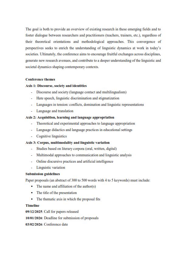 Ce colloque vise à interroger les dynamiques linguistiques, discursives et sociétales à travers des approches pluridisciplinaires mobilisant la linguistique, l’analyse du discours, la sociolinguistique, la didactique, l’étude des corpus, ainsi que d’autres domaines connexes.