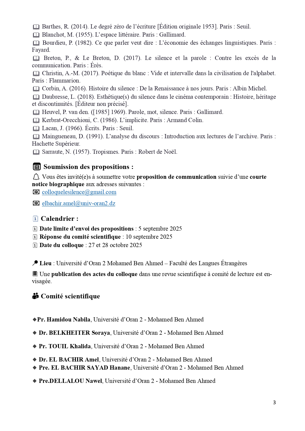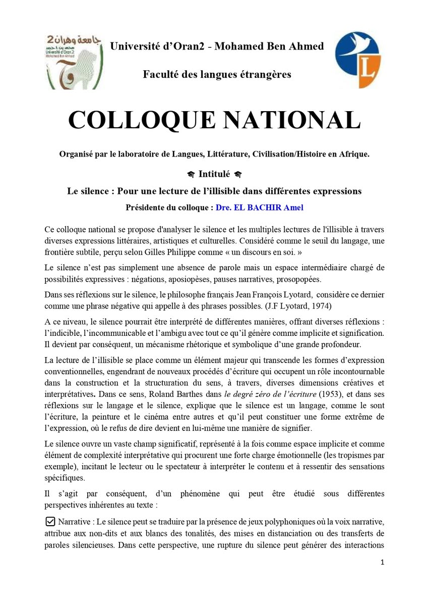 Organisé par le laboratoire Langues, Littérature, Civilisation / Histoire en Afrique (LLCHA), les 27 et 28 octobre 2025 à la Faculté des Langues Étrangères de l’Université d’Oran 2 Mohamed Ben Ahmed.