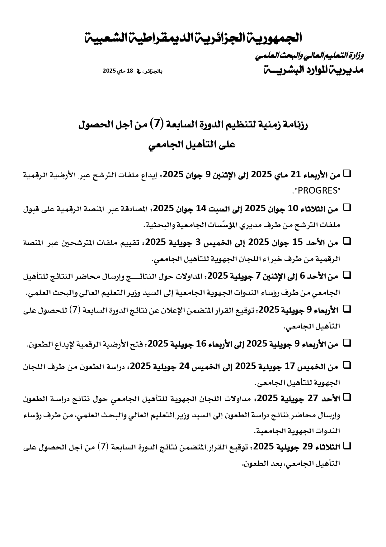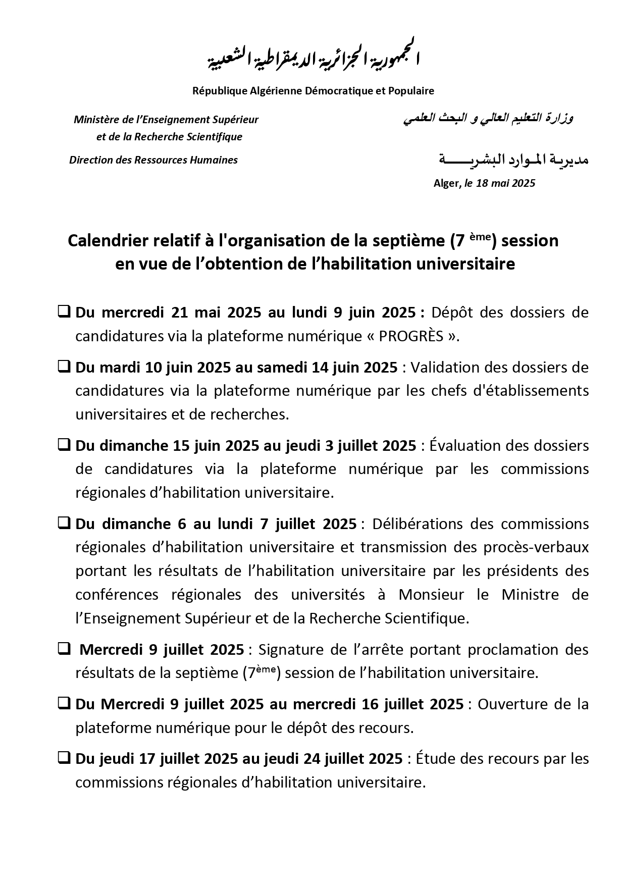 Candidatures au titre de l’année 2025 pour l’accès au grade de Maître de Conférences Classe “A” – 7ᵉ session de l’Habilitation Universitaire