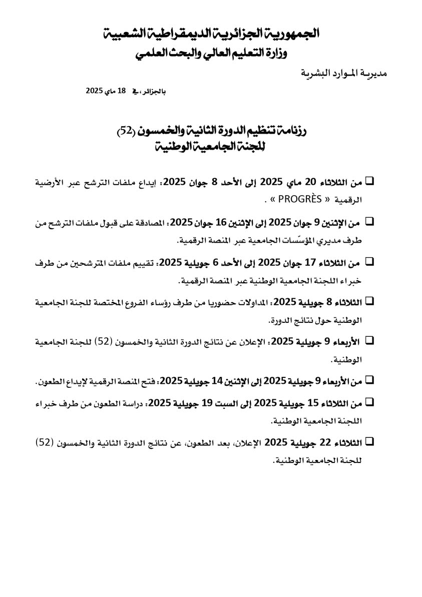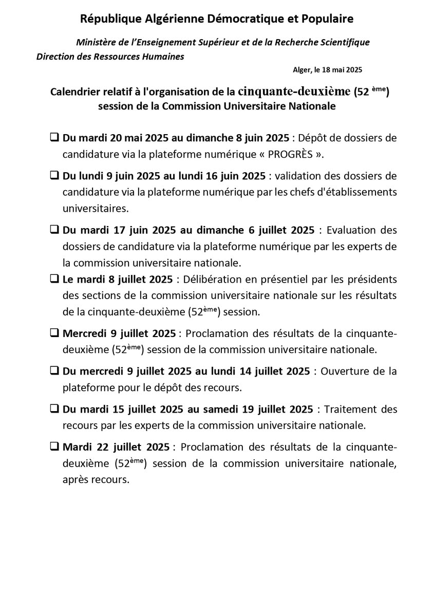 Ce calendrier, publié par la Direction des Ressources Humaines du Ministère de l’Enseignement Supérieur et de la Recherche Scientifique, précise les étapes clés de la 52ᵉ session de la CUN pour le dépôt, l’évaluation, l’annonce et le traitement des candidatures au titre de l’année 2025