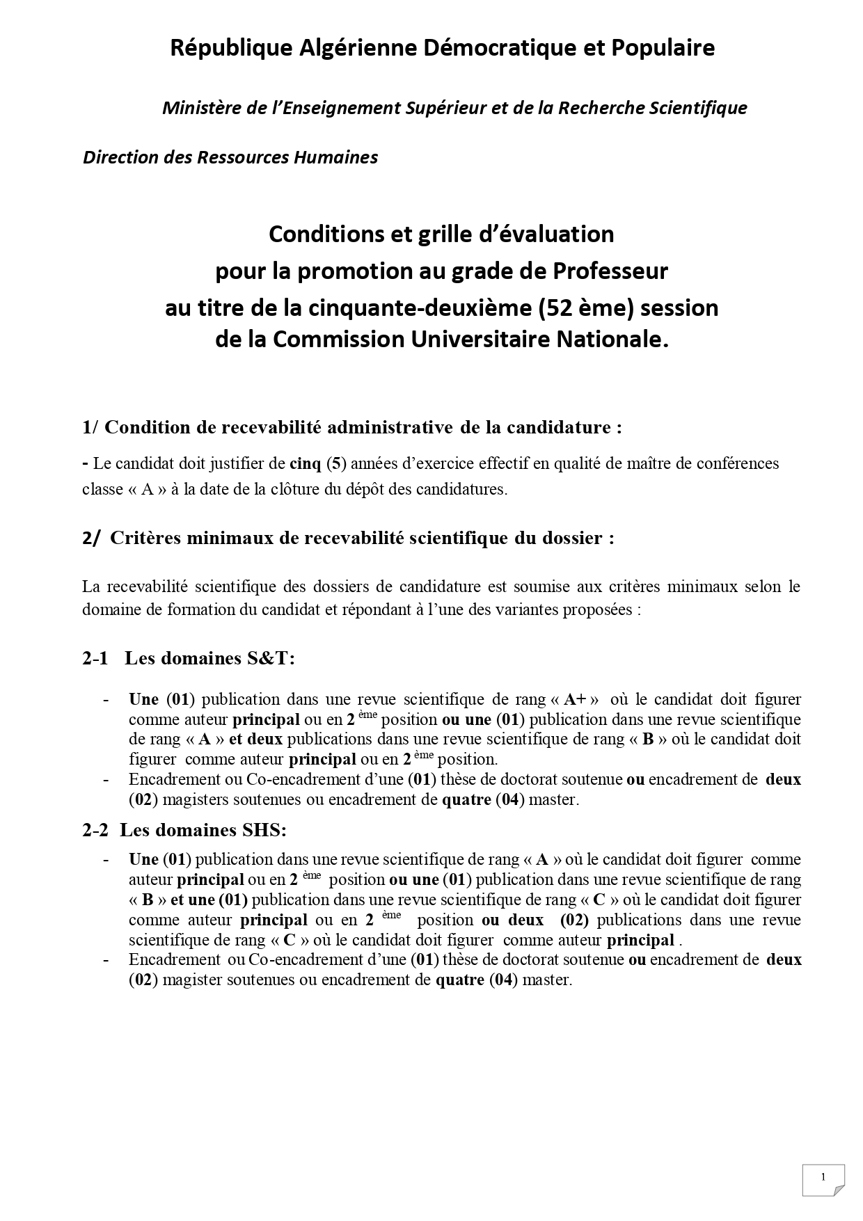 Candidatures au titre de l’année 2025 pour l’accès au grade de Professeur – 52ᵉ session de la Commission Universitaire Nationale