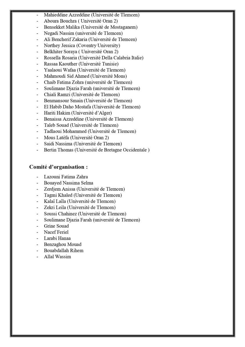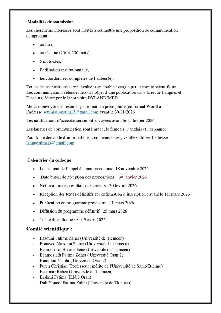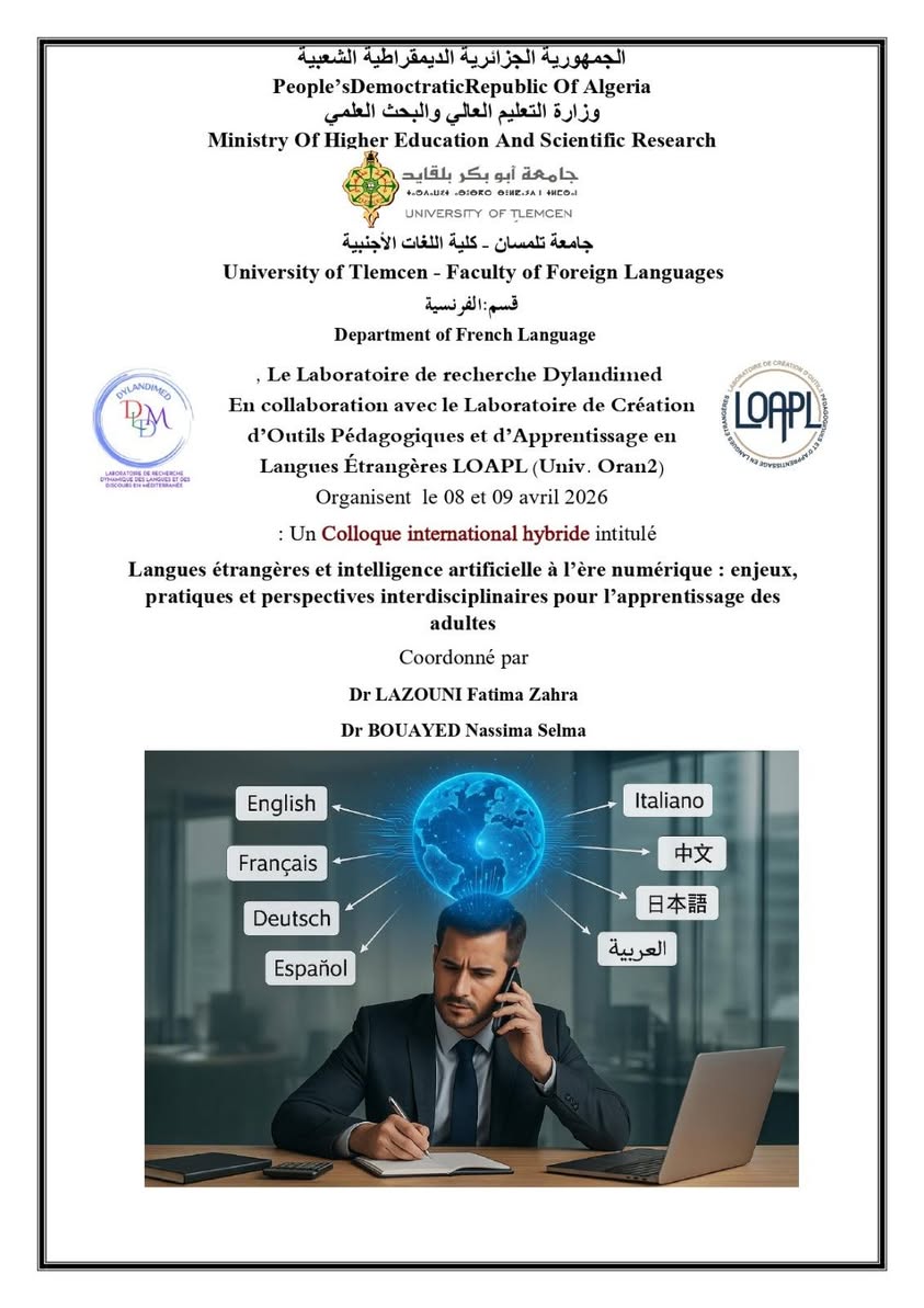 Le Laboratoire de recherche DYLANDIMED (Université de Tlemcen) , en collaboration avec le Laboratoire de Création d’Outils Pédagogiques et d’Apprentissage en Langues Étrangères LOAPL (Université d’Oran 2), a le plaisir d’annoncer l’organisation d’un colloque international hybride intitulé : Langues étrangères et intelligence artificielle à l’ère numérique : enjeux, pratiques et perspectives interdisciplinaires pour l’apprentissage des adultes