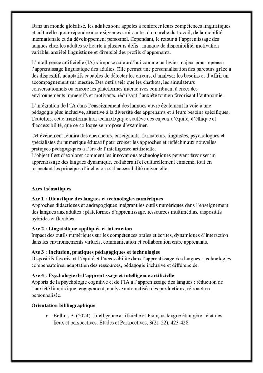 colloque international hybride intitulé : Langues étrangères et intelligence artificielle à l’ère numérique : enjeux, pratiques et perspectives interdisciplinaires pour l’apprentissage des adultes