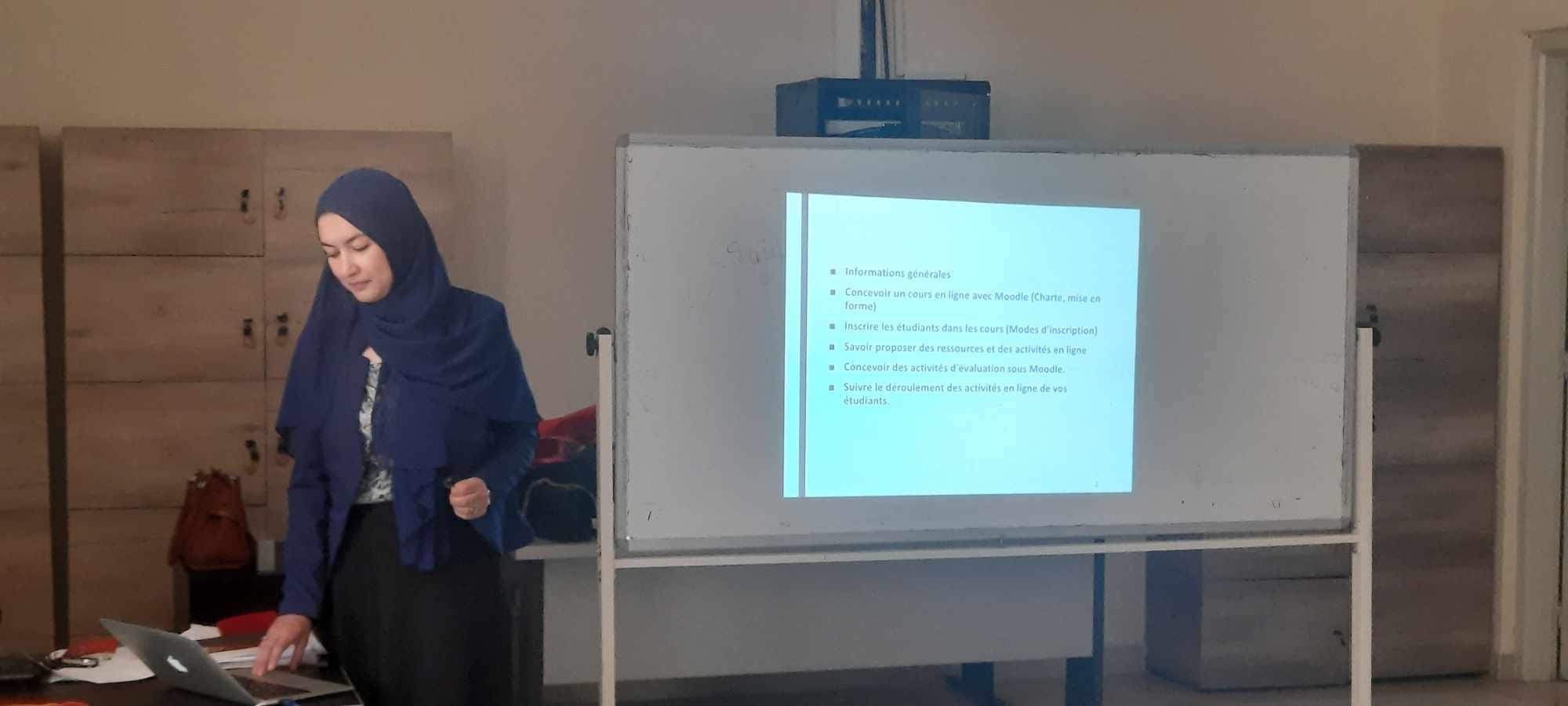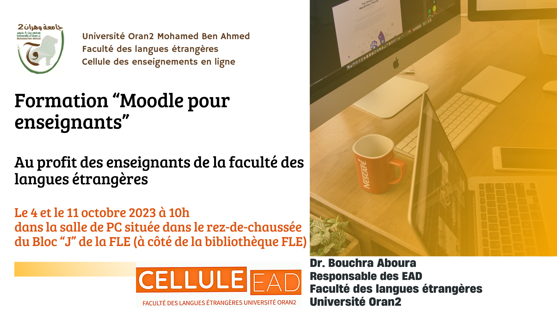 Le 4 octobre 2023 s’est tenue une formation au profit des en des enseignants de la faculté des langues étrangères de l’Université d’Oran 2 sur la plateforme Moodle intitulée “Moodle pour enseignants” organisée par la cellule d’enseignement a distance EAD de la faculté.