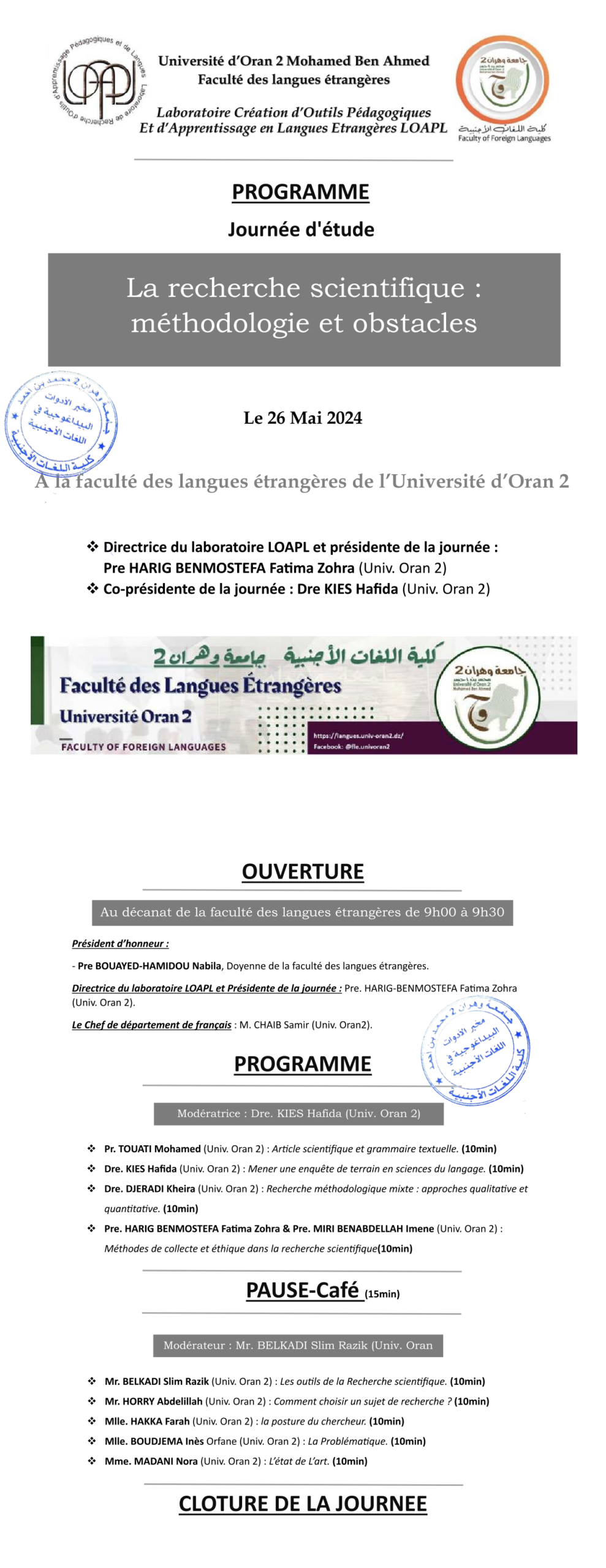 Journée d’étude – La recherche scientifique : méthodologie et obstacles , du 26 Mai 2024