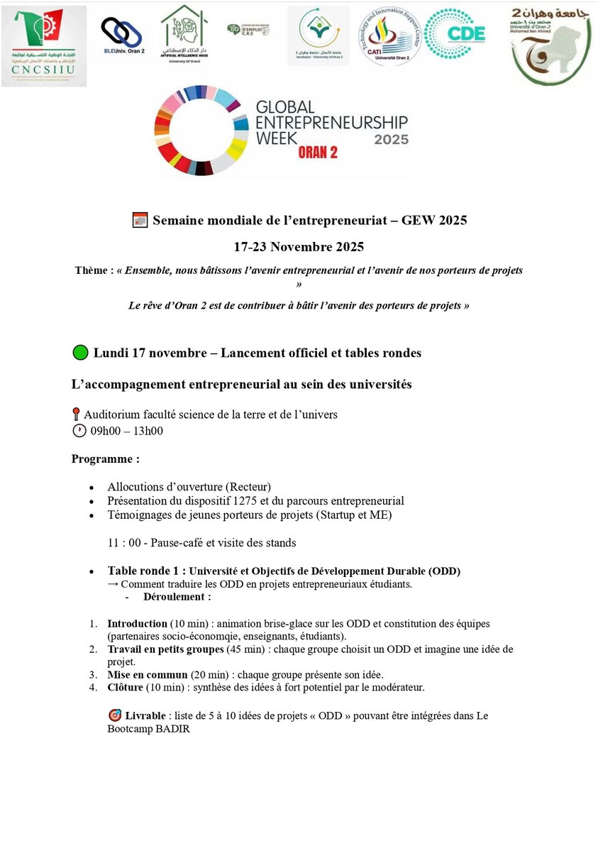 Du 17 au 23 novembre 2025, l’Université d’Oran 2 Mohamed Ben Ahmed célèbre la Global Entrepreneurship Week sous le thème : « Ensemble, nous bâtissons l’avenir entrepreneurial et l’avenir de nos porteurs de projets »