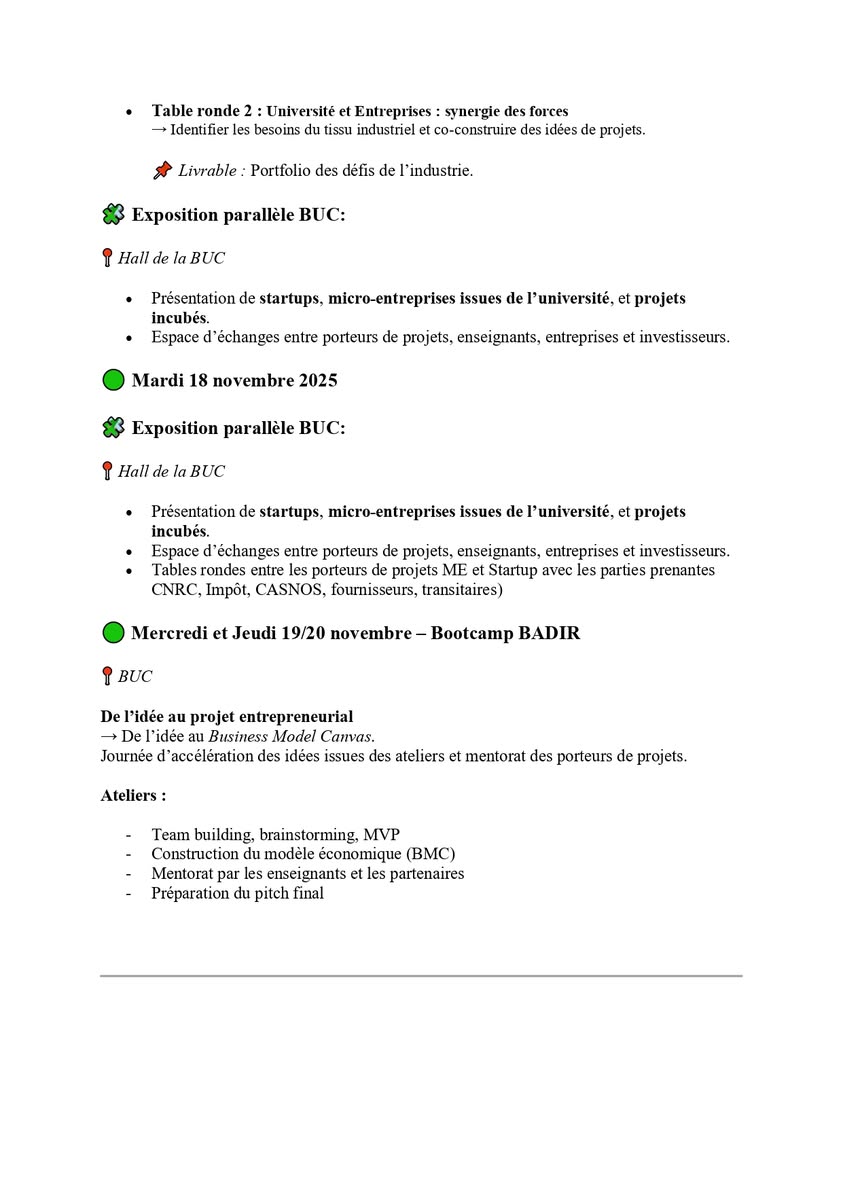 وتشكل هذه المناسبة فرصة مميزة لطلبة ليسانس 3، ماستر 2، ودكتوراه للانطلاق في إعداد مشاريع تخرجهم في إطار القرار 1275، كمشاريع ريادية مبتكرة ذات قيمة مضافة عالية تستجيب للاحتياجات الفعلية للمؤسسات الاقتصادية، وتتوافق مع أهداف التنمية المستدامة.