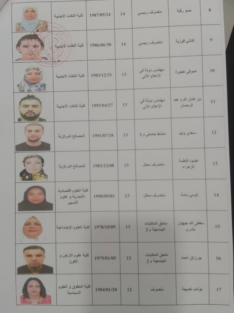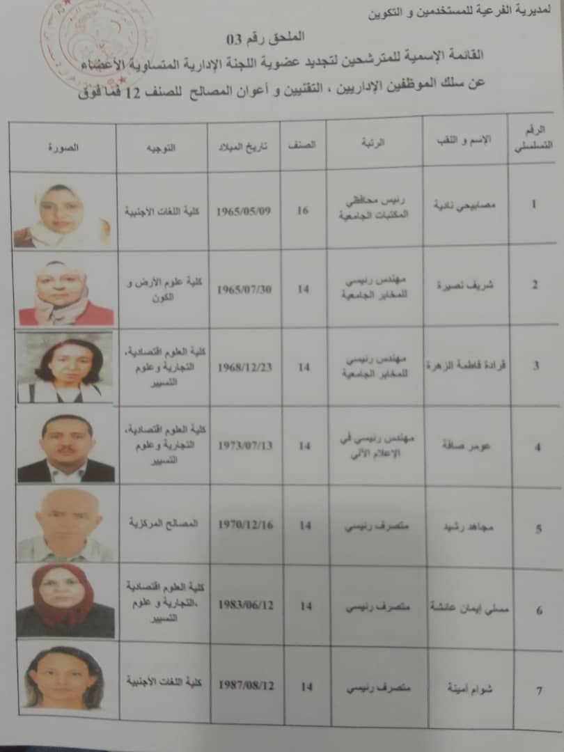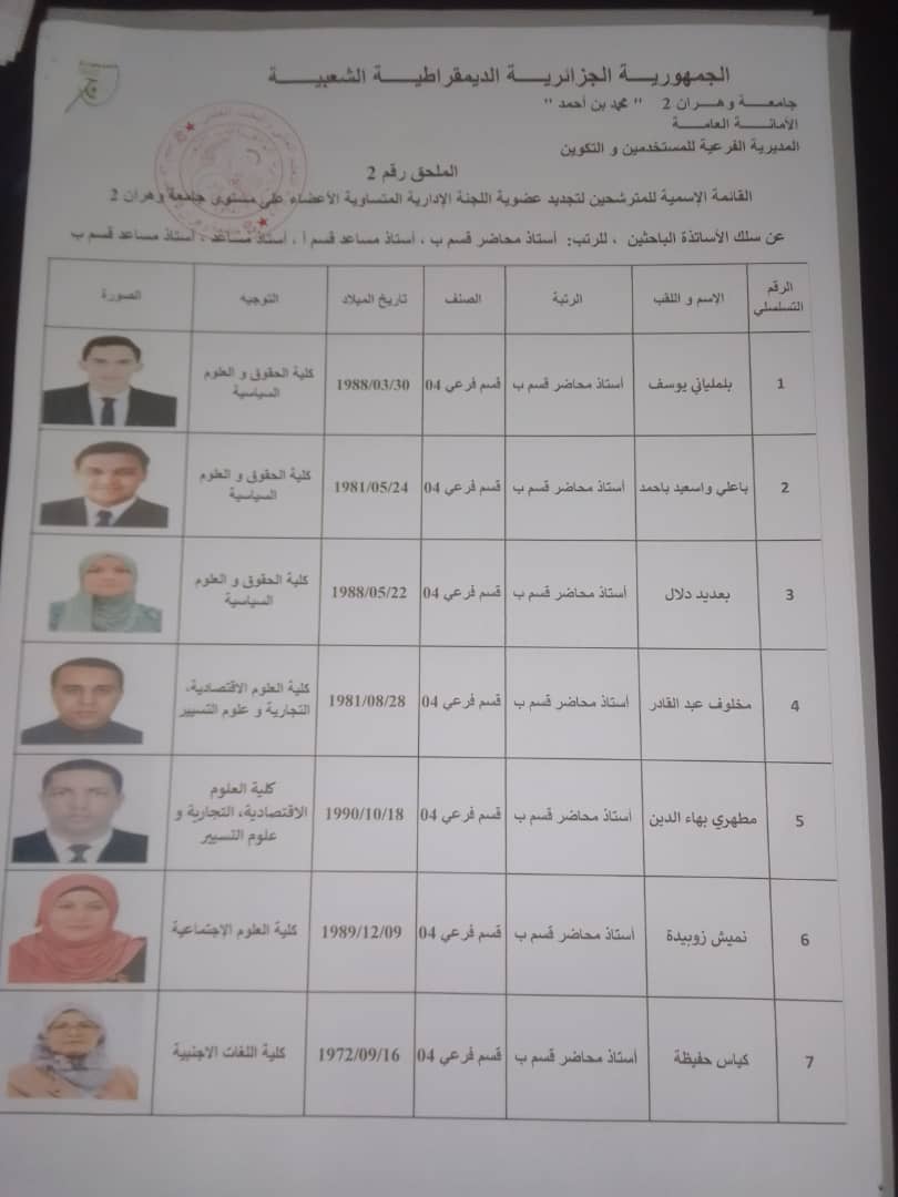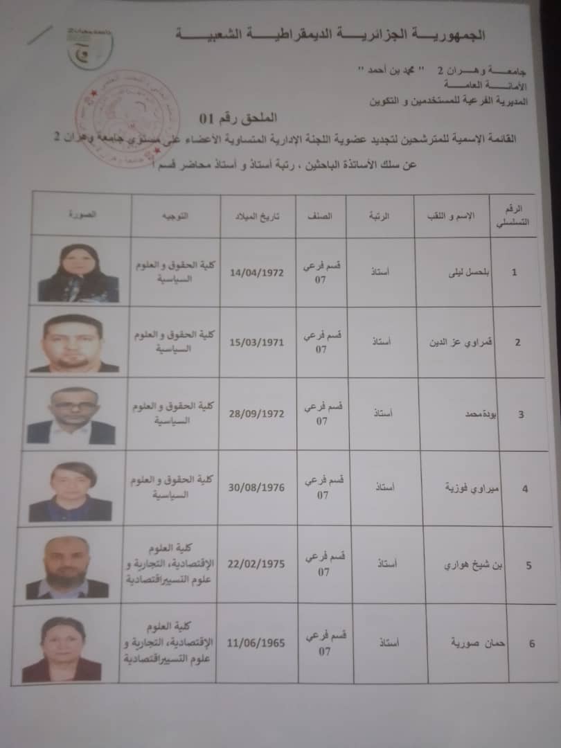 Vous êtes ici :Accueil » Liste officielle des candidats au renouvellement des membres de la commission paritaire administrative au niveau de l’Université Oran 2 – Mohamed Ben Ahmed