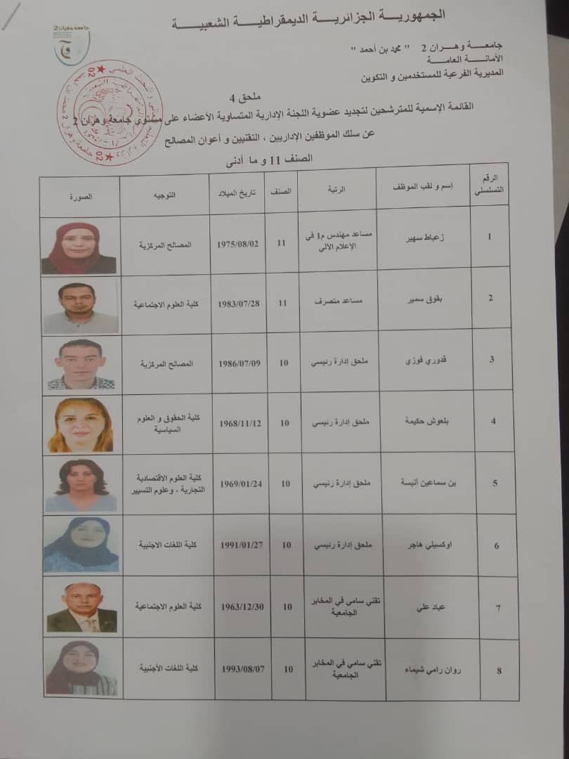 Liste officielle des candidats au renouvellement des membres de la commission paritaire administrative au niveau de l’Université Oran 2 – Mohamed Ben Ahmed