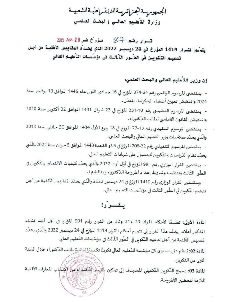 Ministerial Decree No. 87 dated April 20, 2025, supplements Decree No. 1419 dated December 24, 2022, which sets out the core criteria for strengthening doctoral (third-cycle) training in higher education institutions.