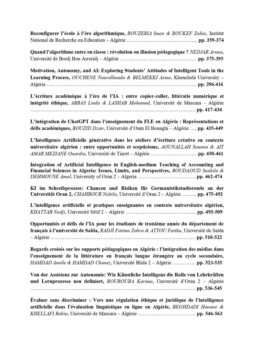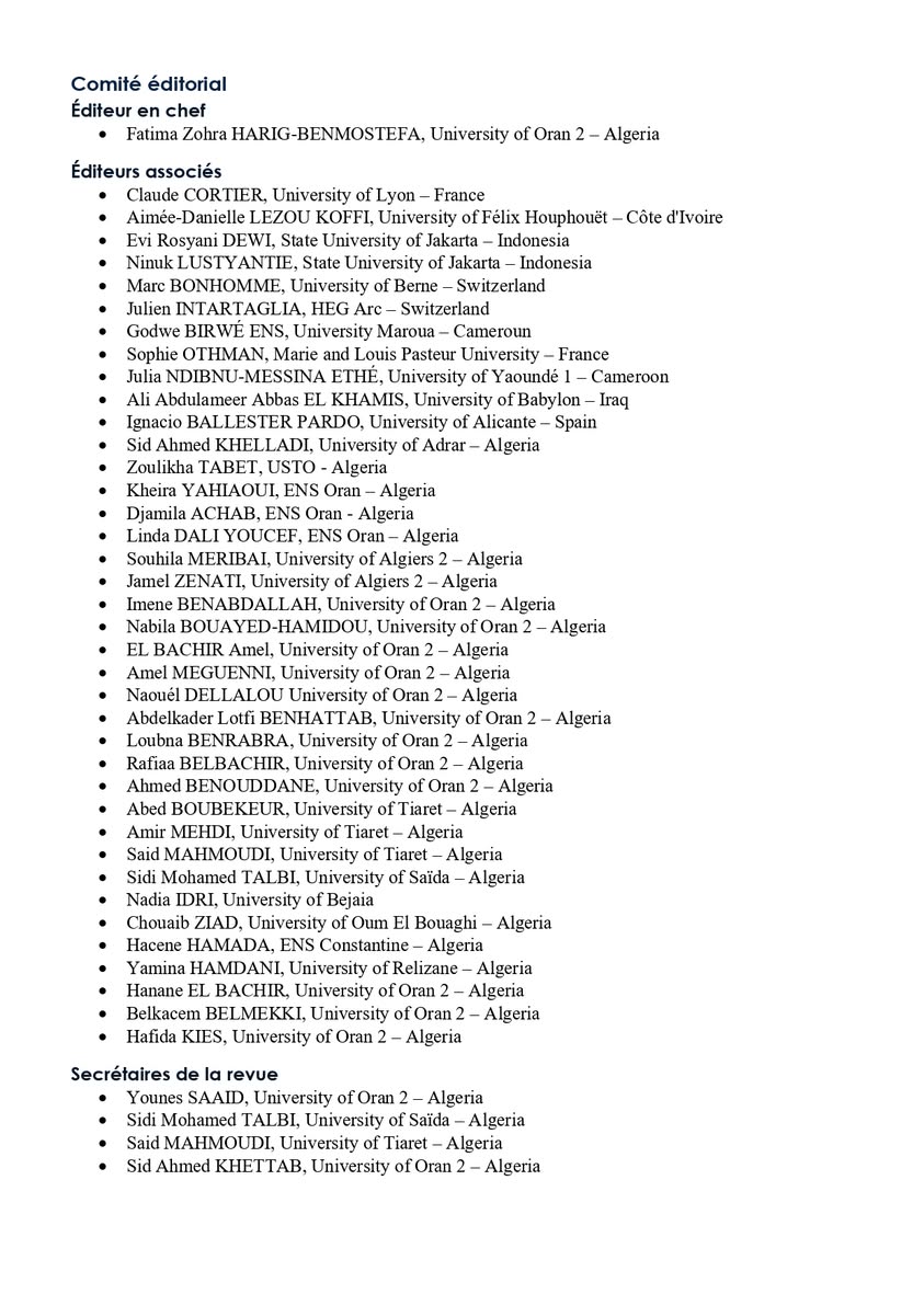 Editor-in-Chief: Fatima Zohra HARIG, University of Oran 2.