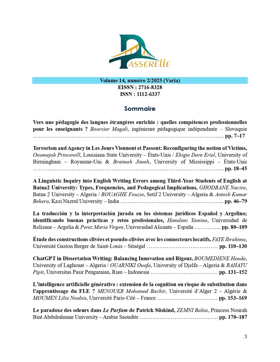 Le numéro ordinaire 2025 – Volume 14, N°02 de la revue Passerelle est désormais publié.