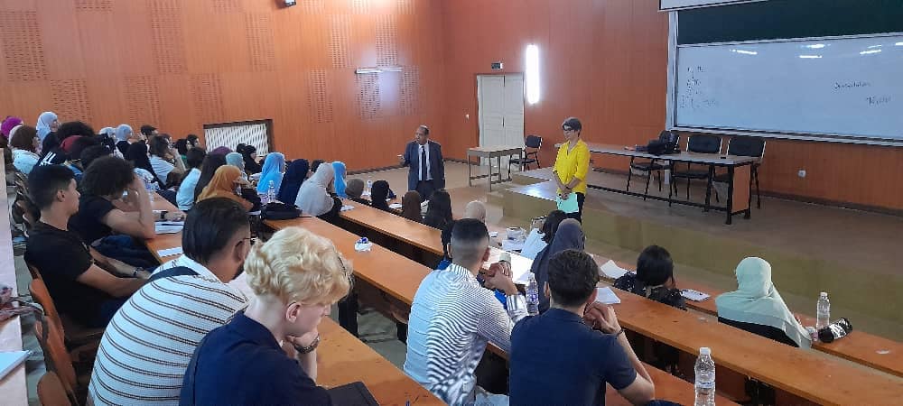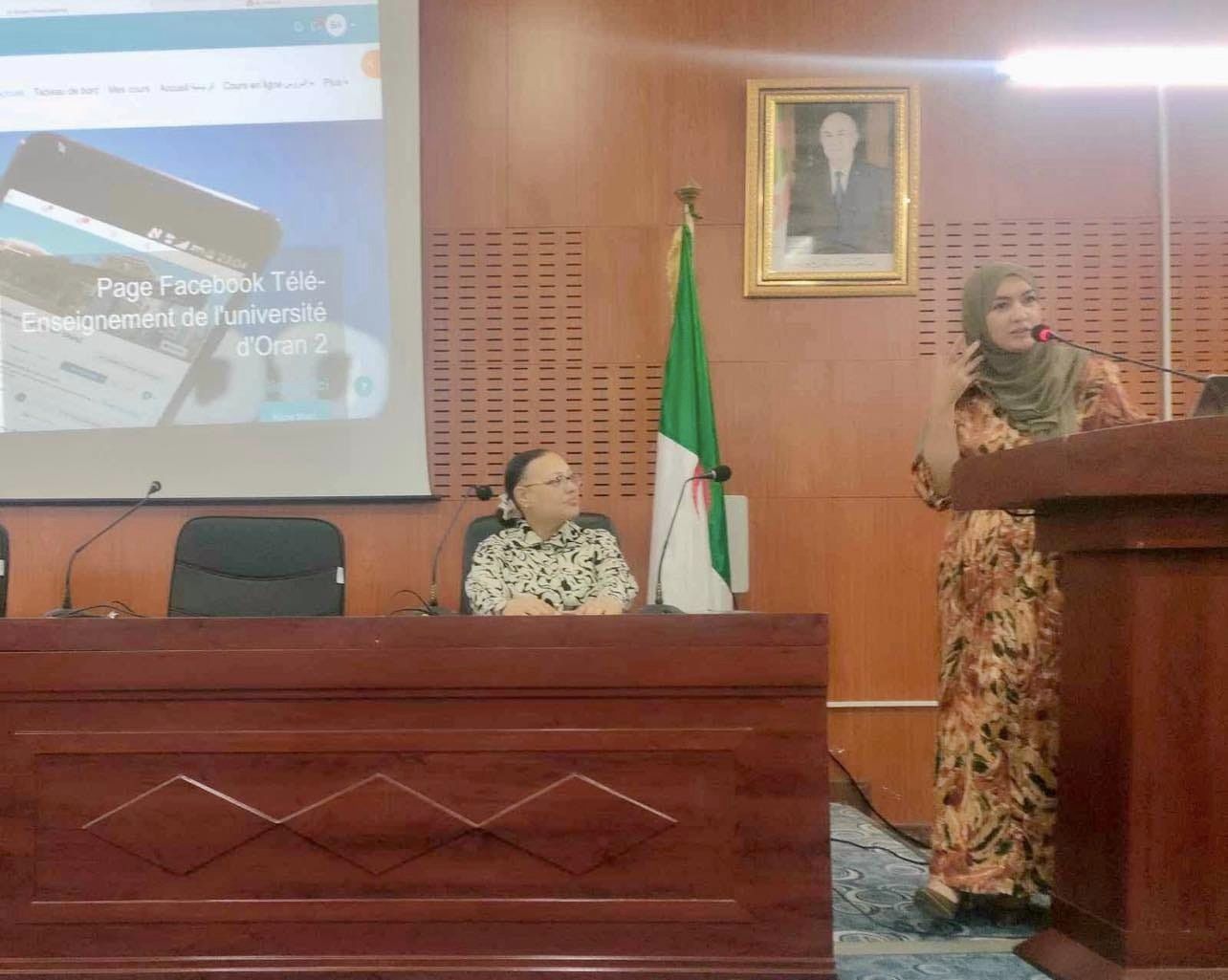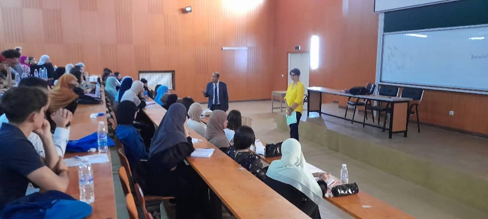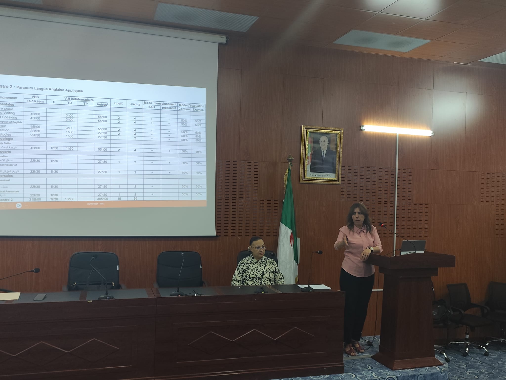 On Monday, September 30, 2024, an orientation session was organized for first-year students of the Double Bachelor’s Degree program in « English Language + Political Science » with the participation of the administrative and academic staff from both the Faculty of Foreign Languages and the Faculty of Law and Political Sciences at the University of Oran 2. During the session, students were provided with guidance and instructions concerning their field of study. The event was attended by the University Rector, Professor CHALLAL Ahmed, and the Dean of the Faculty of Foreign Languages, Professor BOUAYED-HAMIDOU Nabila. The Rector addressed the students, offering them valuable advice on the significance of this double degree program in enhancing their academic and professional competencies. He encouraged them to commit to their studies, excel in both language and political science disciplines, and strive for success.