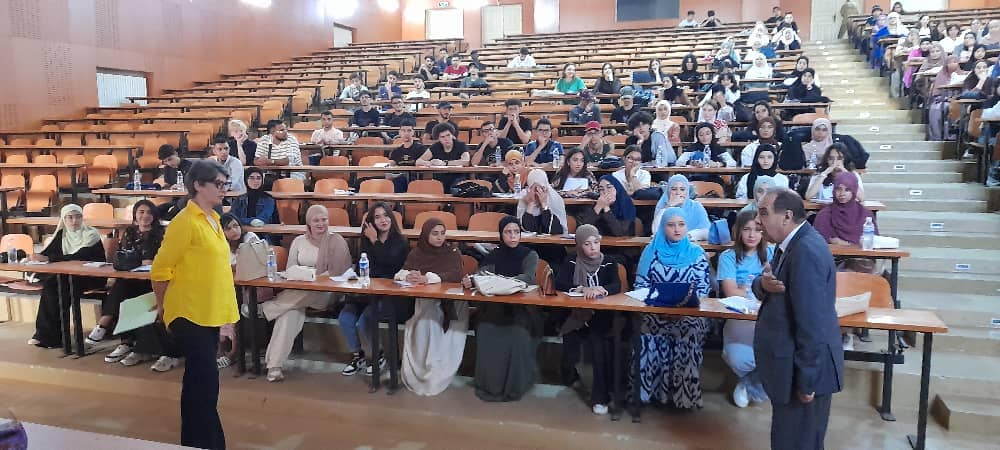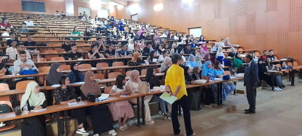 Later that day, the University Rector, Professor CHALLAL, continued his visit to the Faculty of Foreign Languages, accompanied by Dean BOUAYED-HAMIDOU. He visited lecture halls hosting first-year students from various academic departments within the faculty. During his visit, he observed the start of the academic year and welcomed new students to the university, offering them further advice and guidance regarding their academic journey.