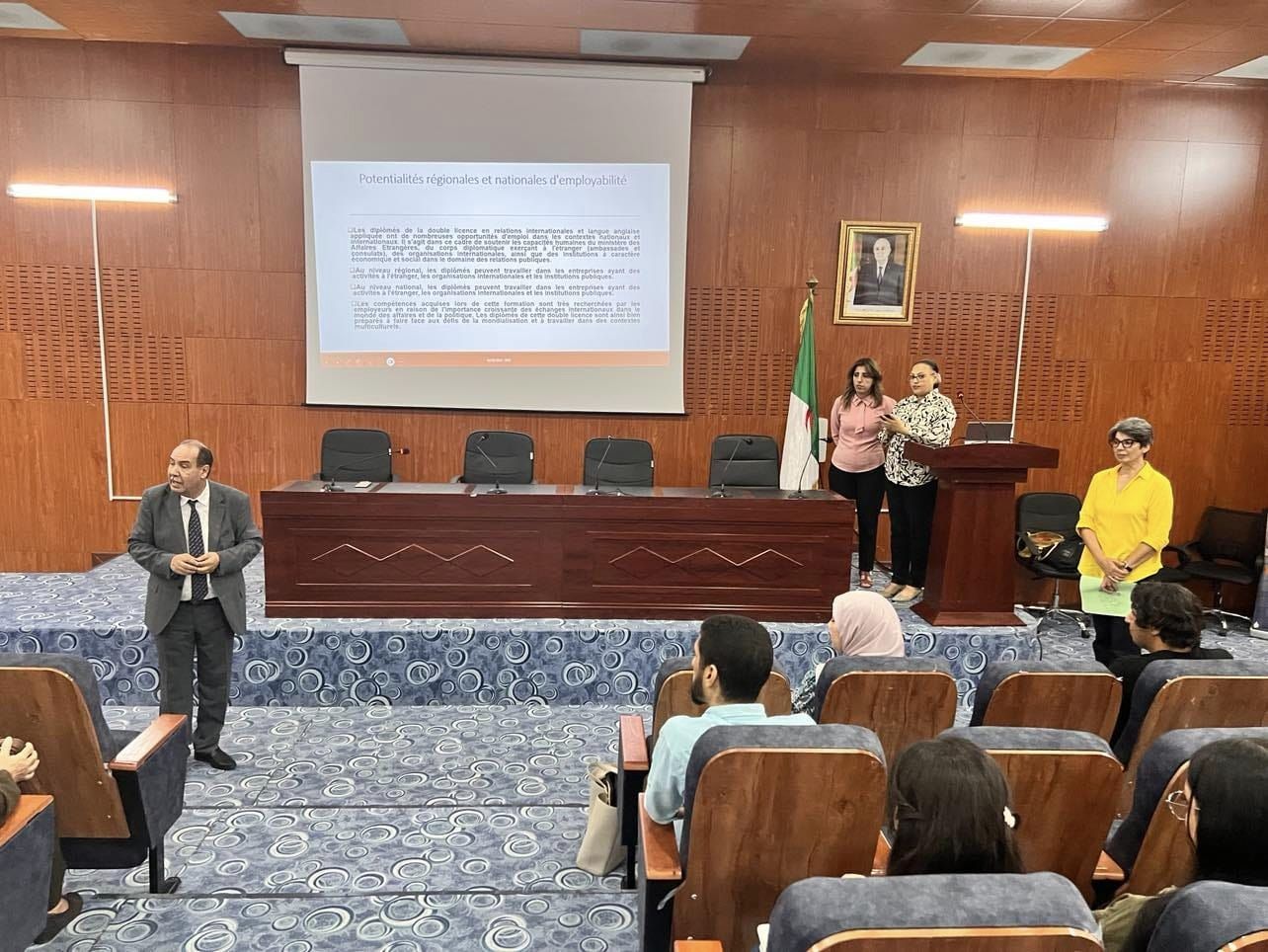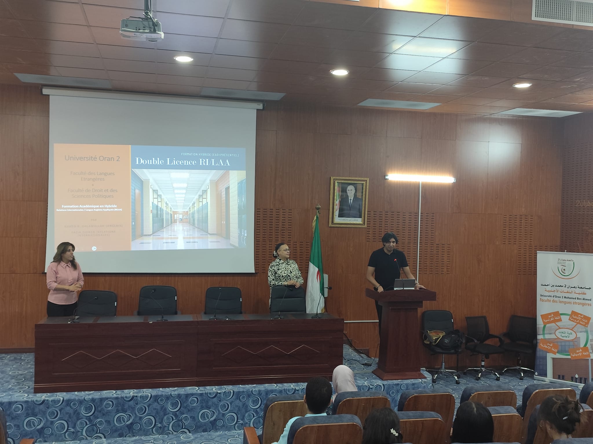 يوم الإثنين 30 سبتمبر 2024، تم تنظيم جلسة توجيهية لطلبة السنة الأولى في برنامج الشهادة المزدوجة « اللغة الإنجليزية + العلوم السياسية » بجامعة وهران 2، بحضور الطاقم الإداري من كليتي اللغات الأجنبية والحقوق والعلوم السياسية. حضر الجلسة مدير الجامعة، الأستاذ شعلال أحمد، وعميدة كلية اللغات الأجنبية، الأستاذة بوعياد-حميدو نبيلة، حيث قدما نصائح للطلبة حول أهمية التفوق في كلا التخصصين.