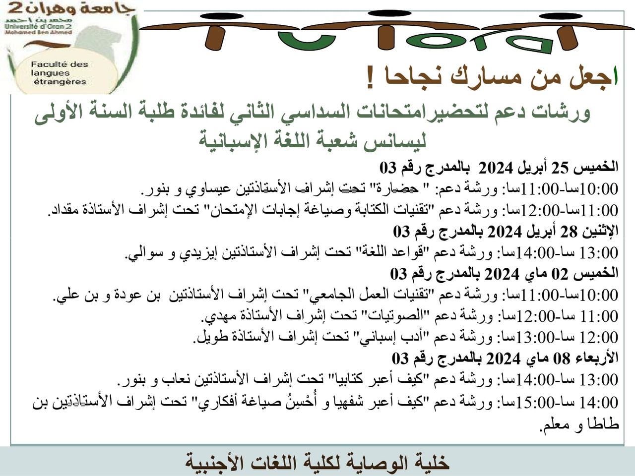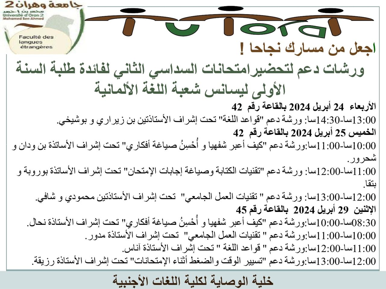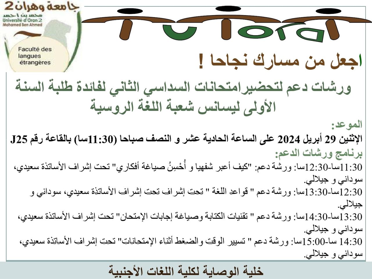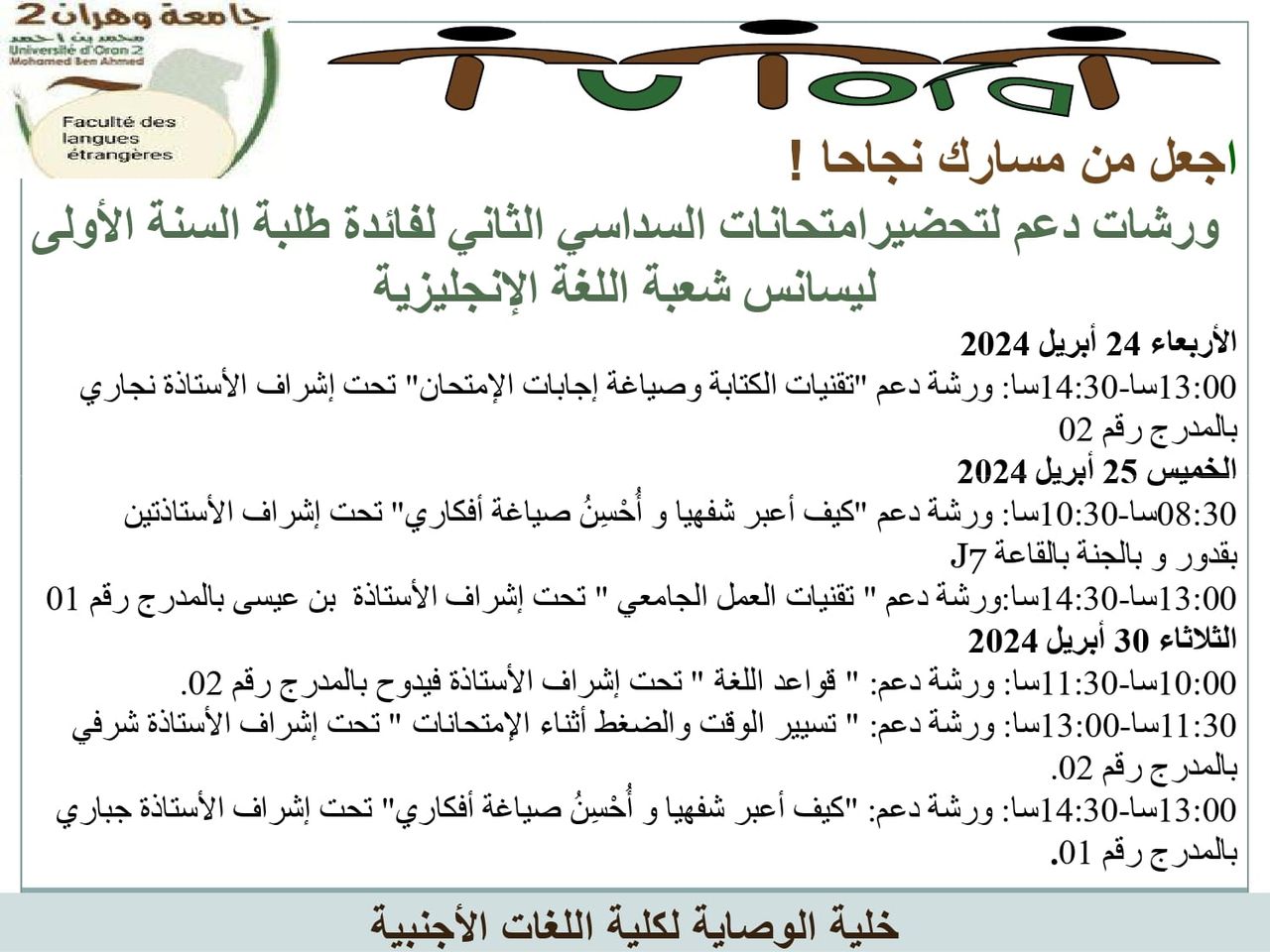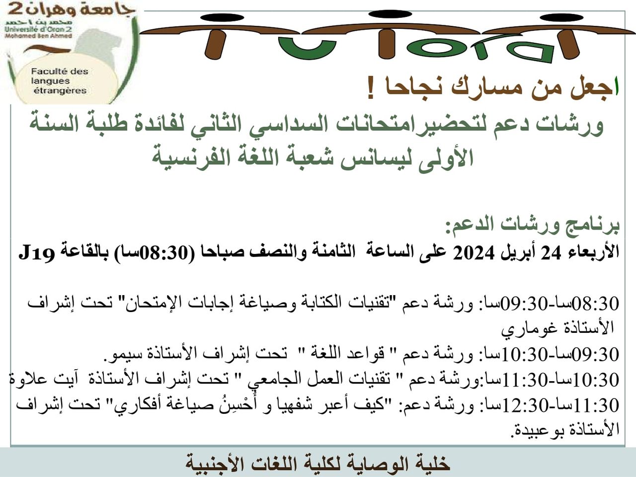 تنظم خلية الوصاية لكلية اللغات الأجنبية ابتداءا من يوم الأربعاء 24 أبريل 2024 و إلى غاية يوم الأربعاء 08 ماي 2024 ورشات دعم لتحضيرامتحانات السداسي الثاني لفائدة طلبة السنة الأولى ليسانس للشعب الخمسة (الفرنسية, الروسية, الألمانية, الإنجليزية و الإسبانية) تحت إشراف الأساتذة الوصيين لكل شعبة. ترفق هذه الدعوة ببرامج الدعم الخاصَّة بكلِّ شعبة.