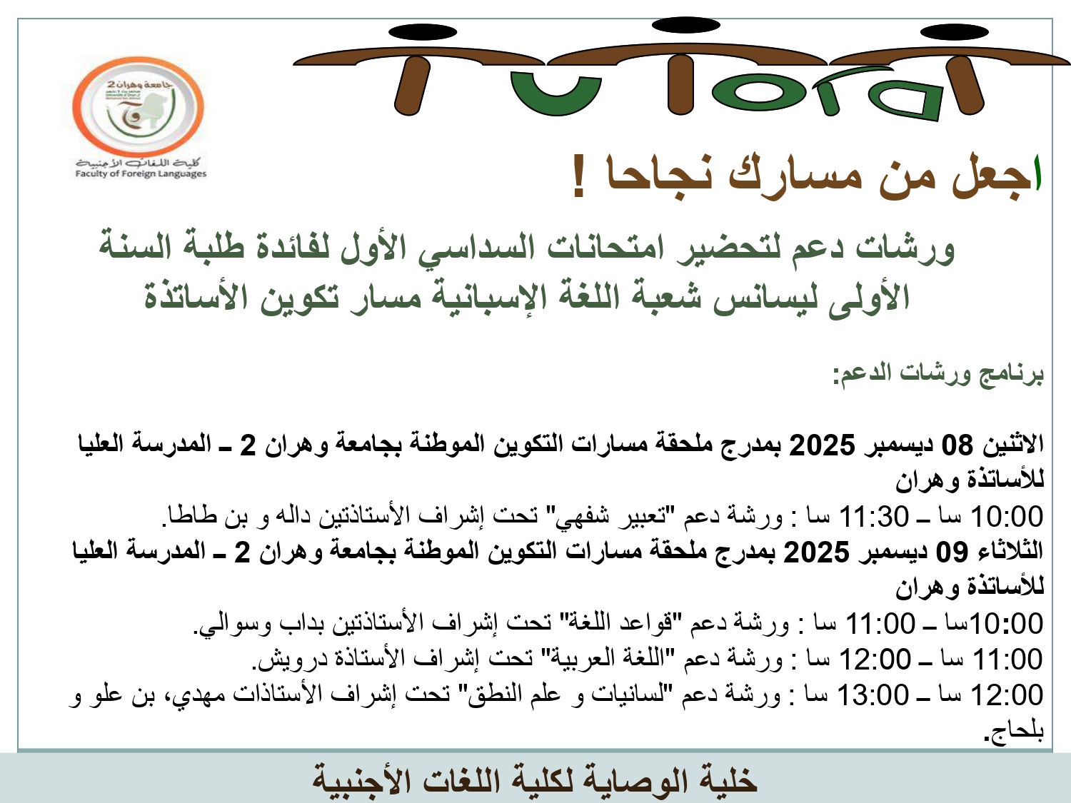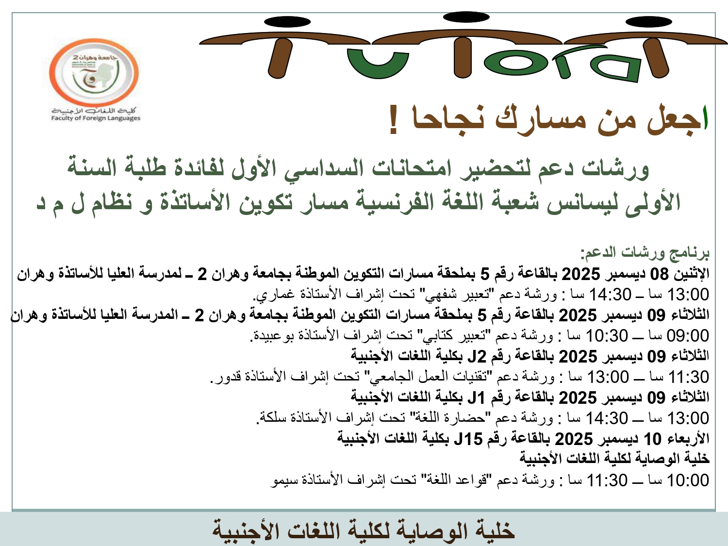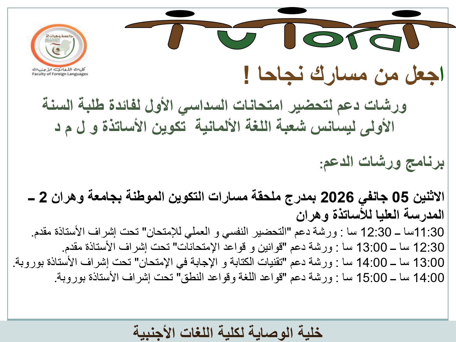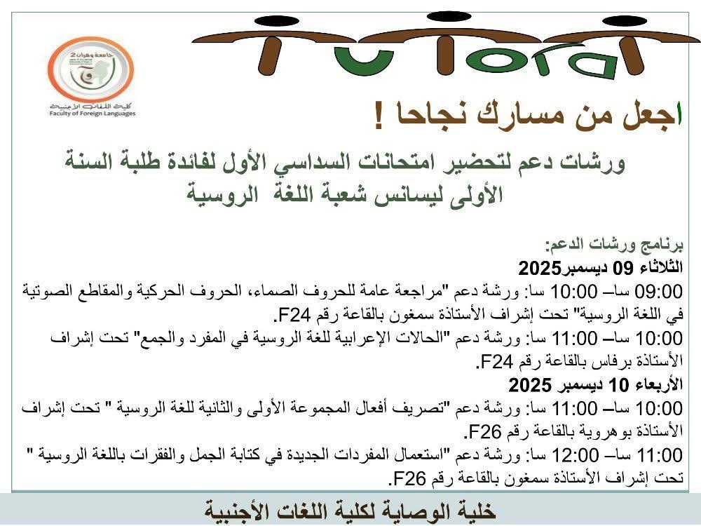 نظم خلية الوصاية لكلية اللغات الأجنبية بجامعة وهران 2 ورشات دعم لتحضير امتحانات السداسي الأول لفائدة طلبة السنة الأولى (ليسانس وملحة مدرسة عليا للأستاذة) اللغة الروسية، اللغة الفرنسية، اللغة الألمانية واللغة الإسبانية حسب البرنامج المرفق.