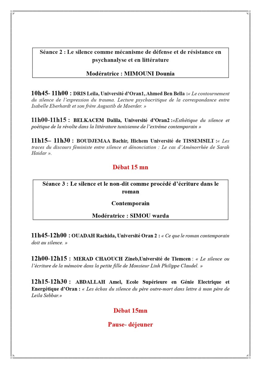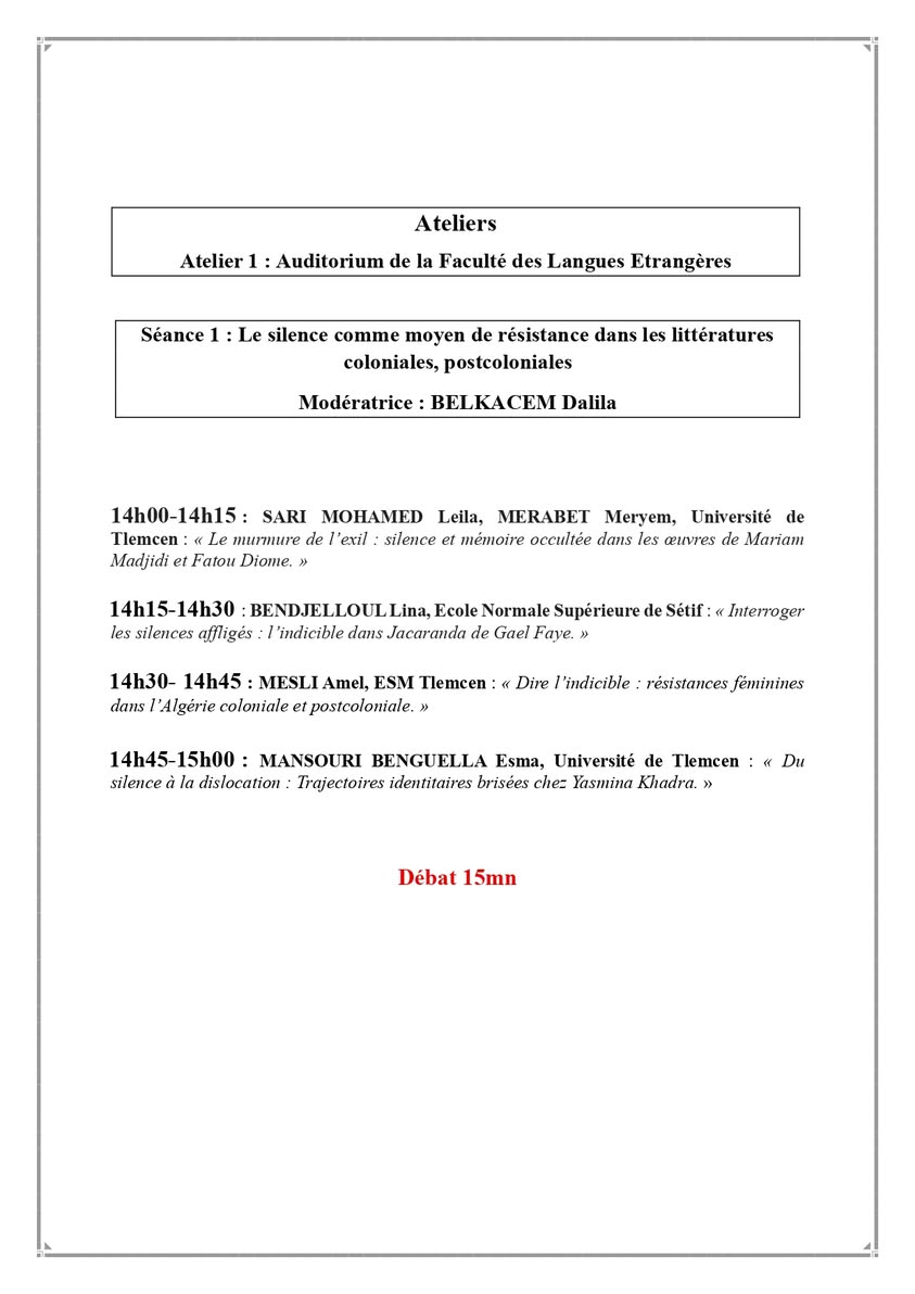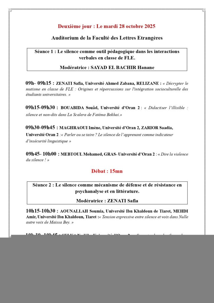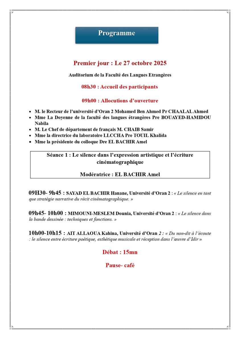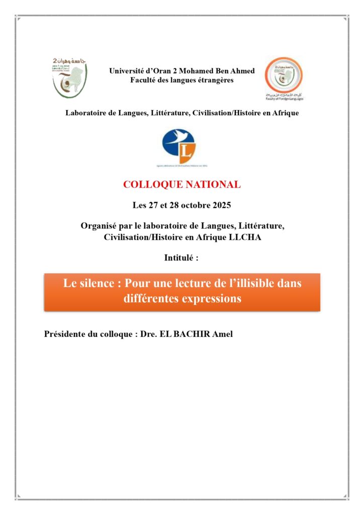 Ci-joint le programme du colloque national intitulé « Le silence : Pour une lecture de l’illisible dans différentes expressions », organisé par le laboratoire Langues, Littérature, Civilisation et Histoire en Afrique (LLCHA) en collaboration avec le département d’espagnol, qui se tiendra les 27 et 28 octobre 2025 à la faculté des langues étrangères de l’Université d’Oran 2 Mohamed Ben Ahmed.