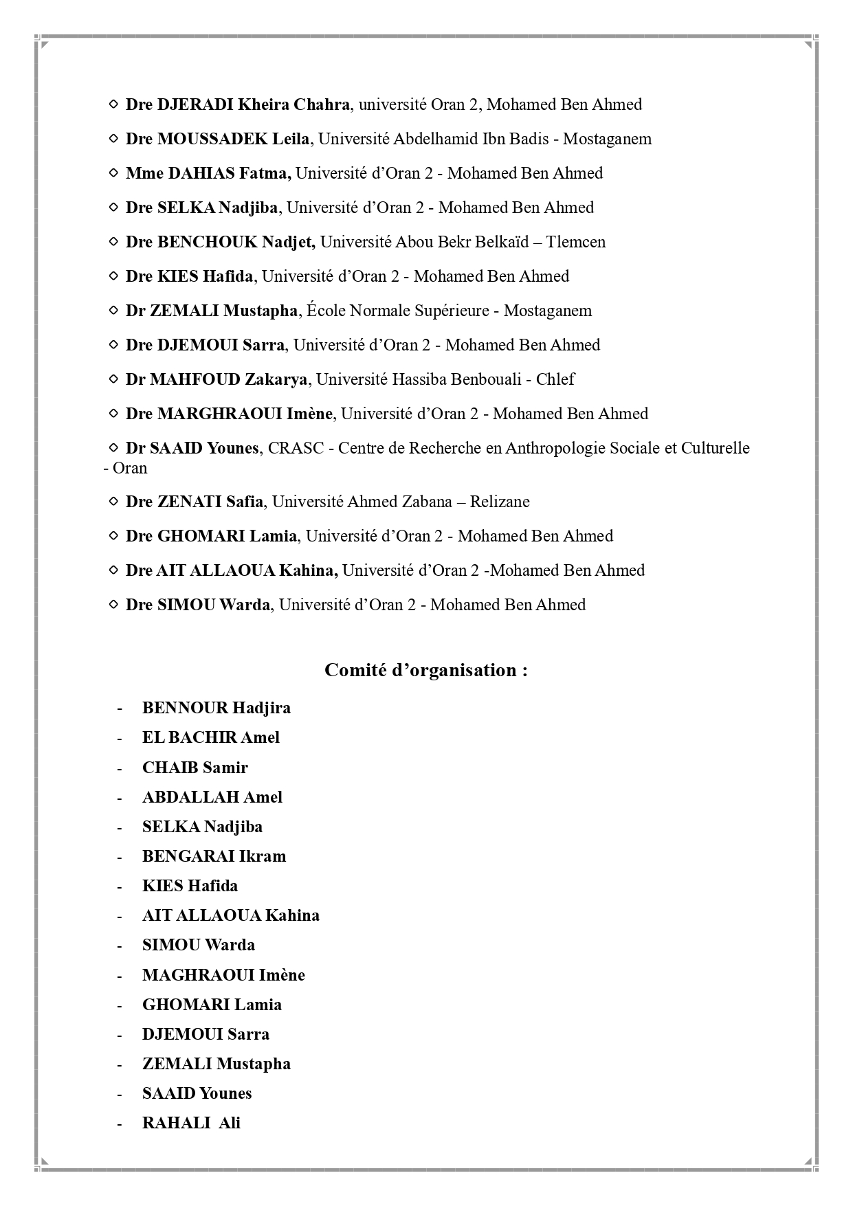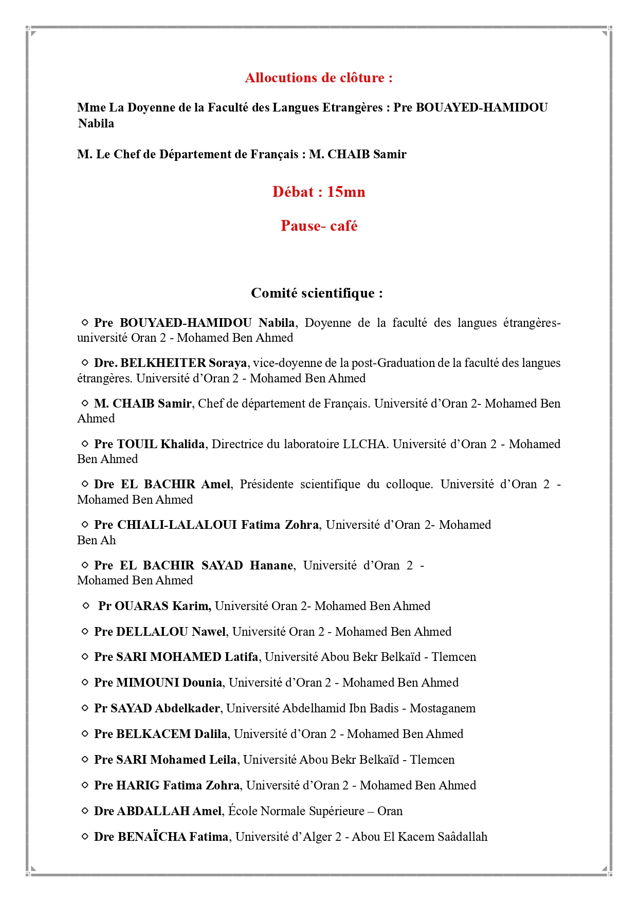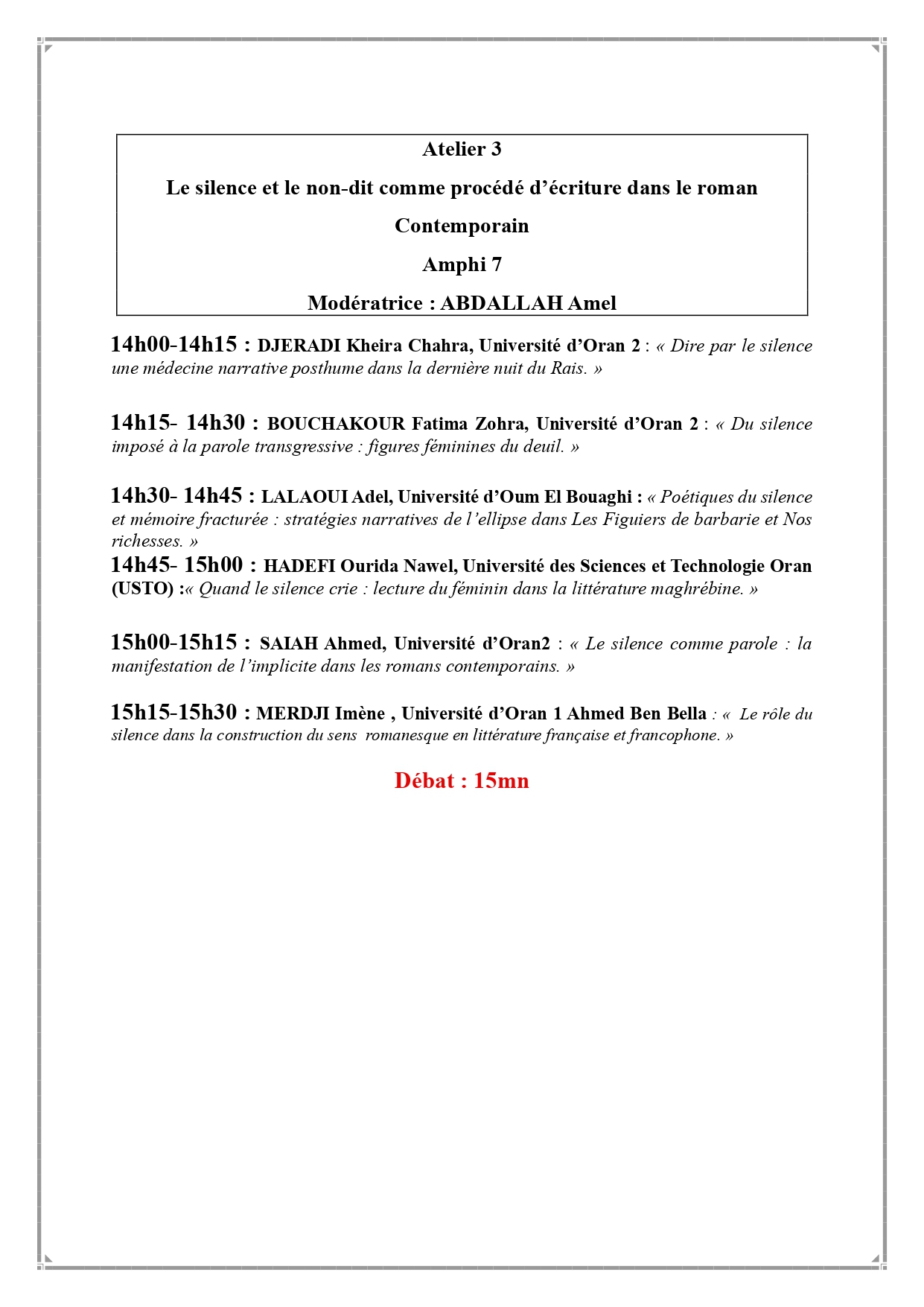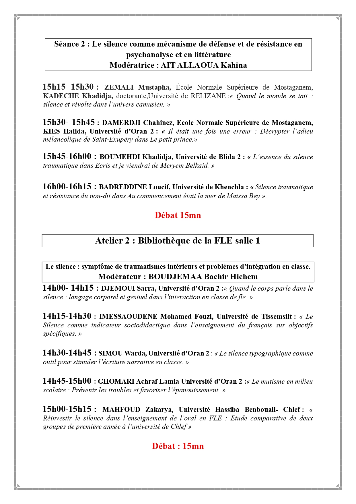 Ci-joint le programme du colloque national intitulé « Le silence : Pour une lecture de l’illisible dans différentes expressions », organisé par le laboratoire Langues, Littérature, Civilisation et Histoire en Afrique (LLCHA) en collaboration avec le département d’espagnol, qui se tiendra les 27 et 28 octobre 2025 à la faculté des langues étrangères de l’Université d’Oran 2 Mohamed Ben Ahmed.