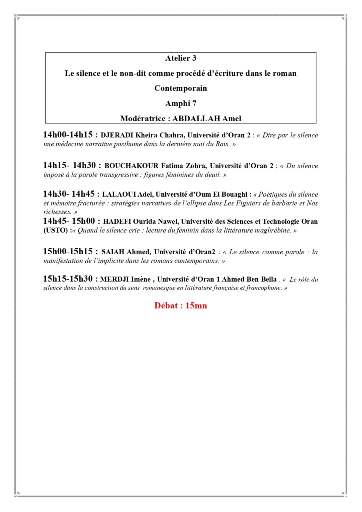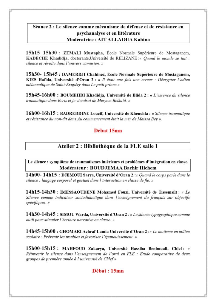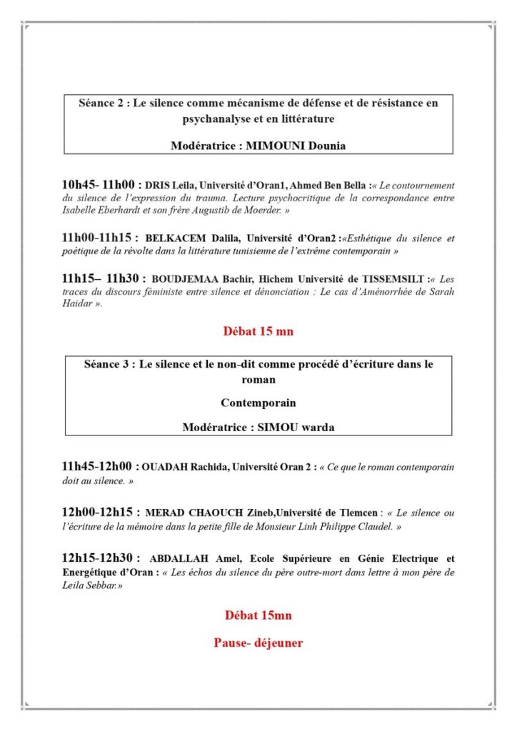 programme du colloque national intitulé  » Le silence : Pour une lecture de l’illisible dans différentes expressions «