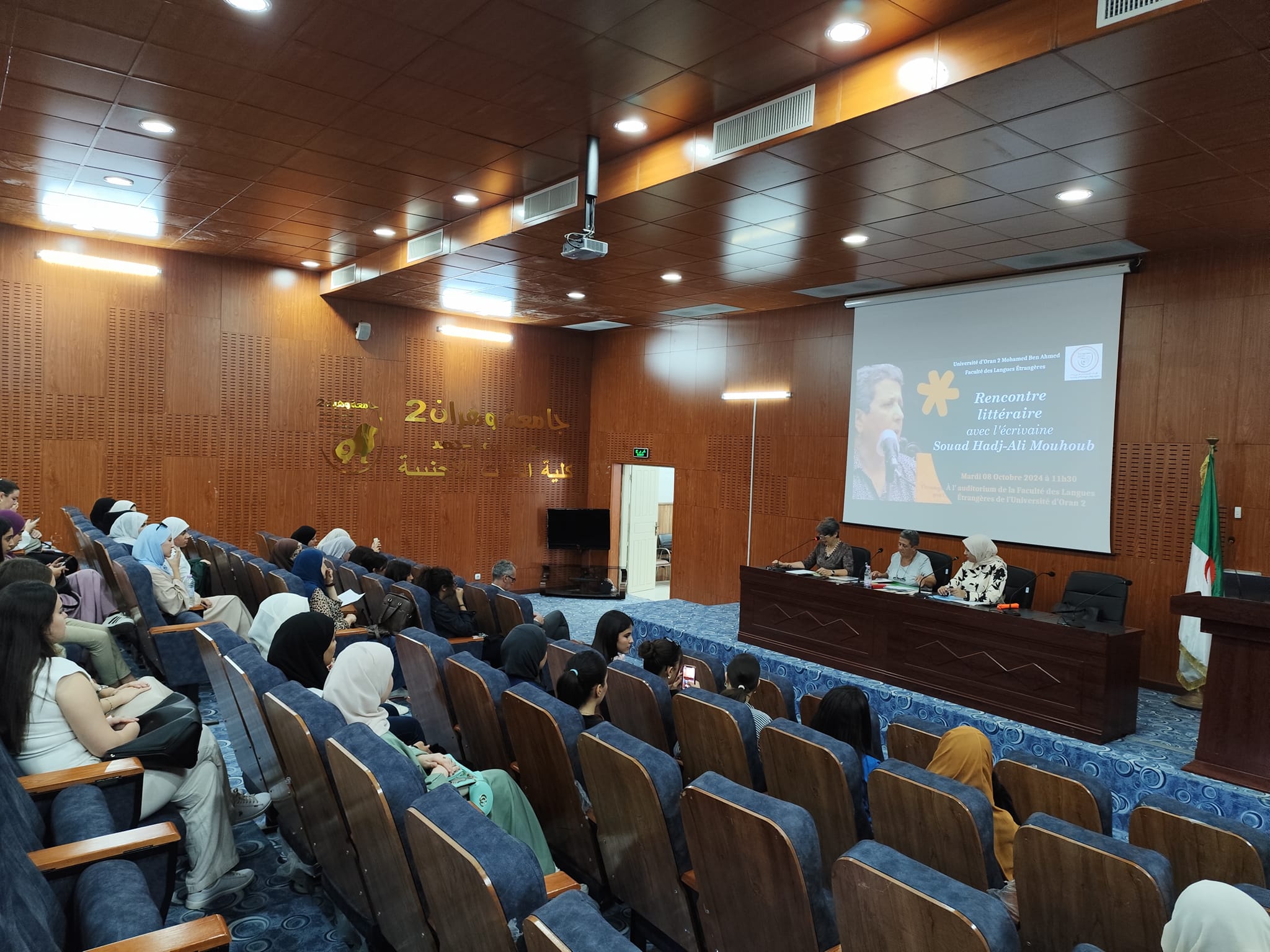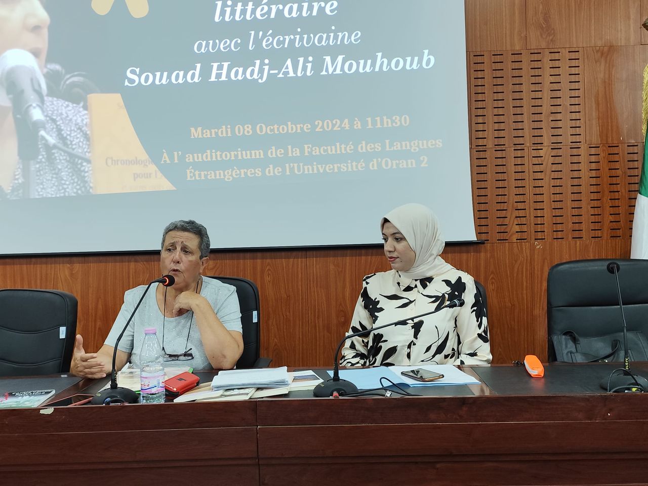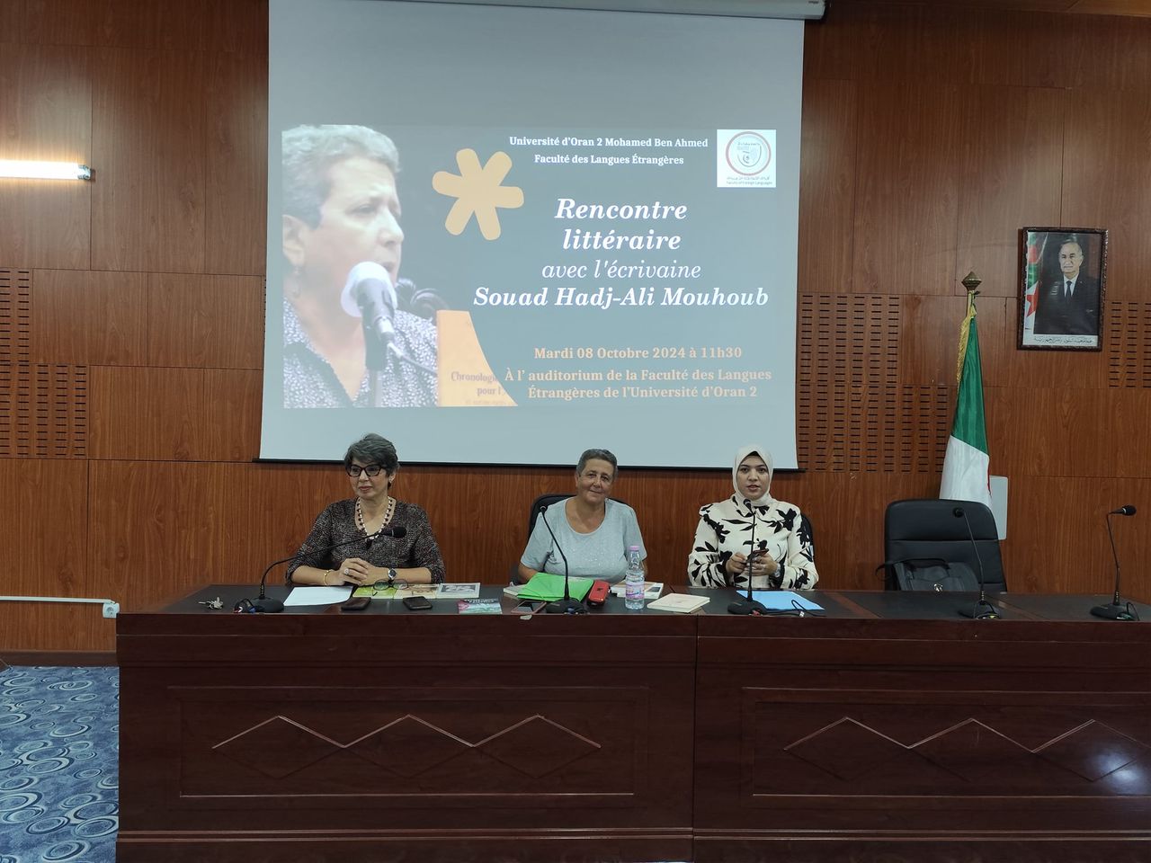 La Faculté des Langues Étrangères de l’Université d’Oran 2 a organisé une rencontre littéraire avec l’écrivaine Souad Hadj-Ali Mouhoub aujourd’hui le mardi 8 octobre 2024 à 11h30 à l’auditorium de la faculté.