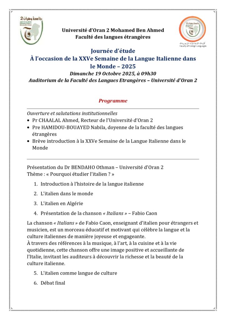 À l’occasion de la XXVe Semaine de la Langue Italienne dans le Monde, la Faculté des Langues Étrangères de l’Université d’Oran 2 a le plaisir d’inviter l’ensemble des enseignants et des étudiants à une journée d’étude dédiée à la langue et à la culture italiennes.