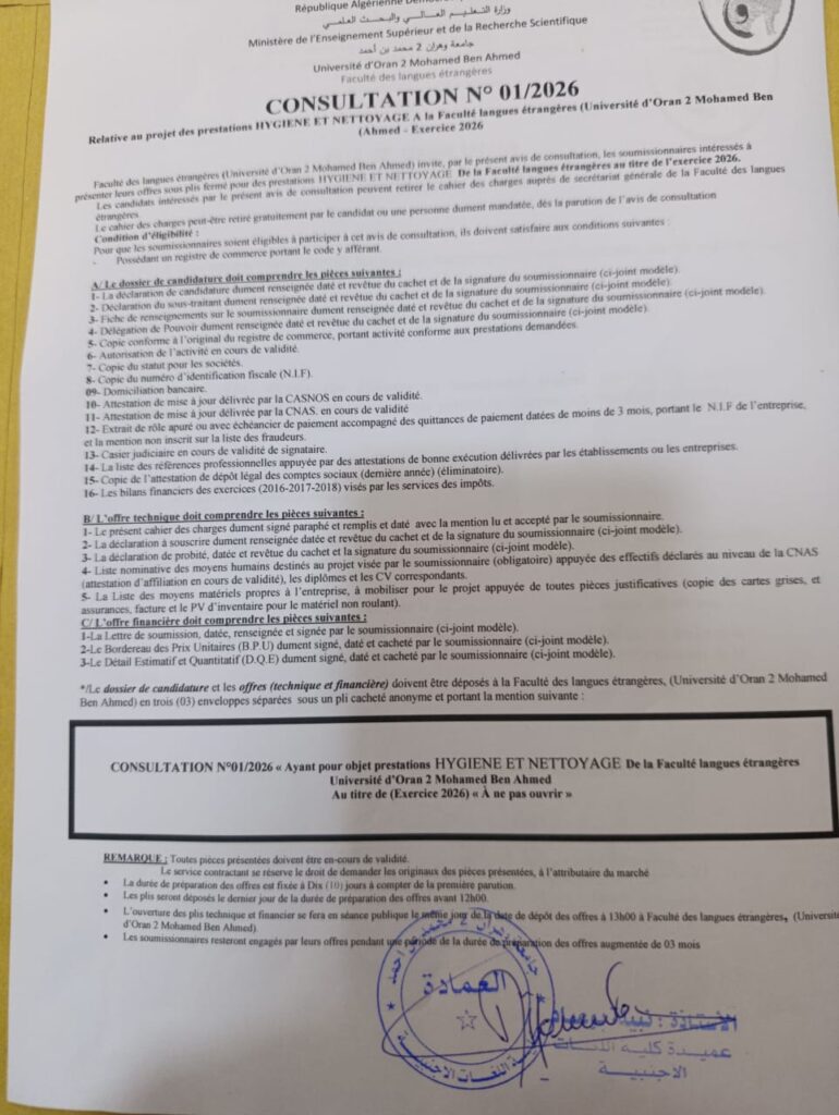 Consultation Notice No. 07/2025 – Faculty of Foreign Languages (University of Oran 2)